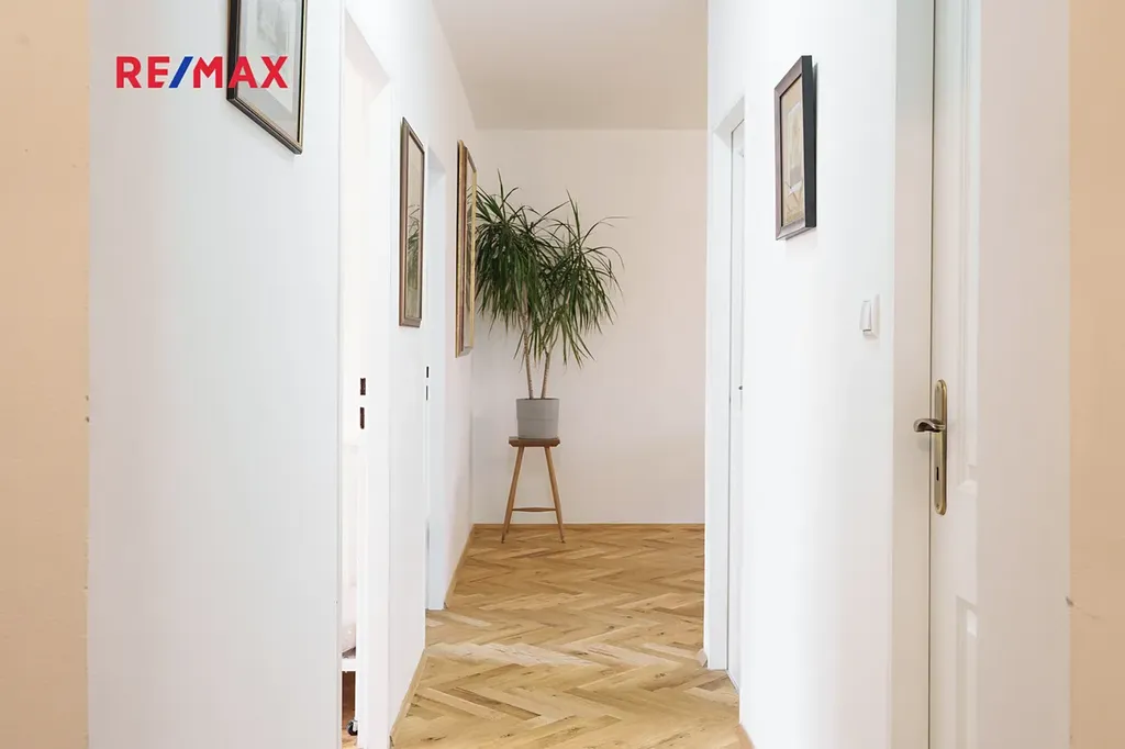 Byt je po rekonstrukci před nedávnou dobou, velkou ozdobou jsou parkety bez prahů vedoucí do ložnic, obýváku, kuchyně i chodeb. Obývák je tak velký, že by zde snadno mohla vzniknout ještě jedna ložnice. Nebo by se zde návratem k původním dveřím mohl obnovit přístup do kuchyně a v jídelně by mohla být třetí ložnice. Teď je to ale krásný velkorysý prostor se dvěma ložnicemi, obývákem s výstupem na lodžii, samostatnou kuchyní a jídelnou, která je srdcem bytu a má výstup na druhou lodžii. Velkým bonusem bytu je walk in šatna v předsíni. Koupelna je samostatná a najdete tu jak sprchový kout, tak vanu.