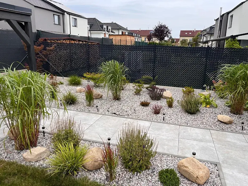 Zahradní posezení je zasazeno tak, aby splňovalo absolutní soukromí a navazuje na zděný zahradní sklad.