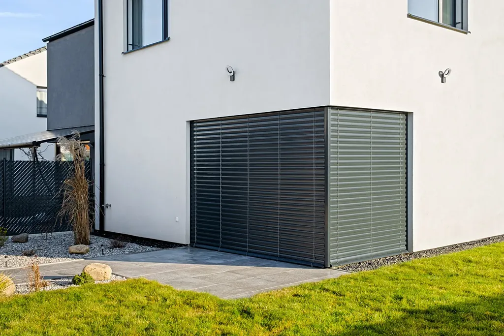 Zahradní posezení je zasazeno tak, aby splňovalo absolutní soukromí a navazuje na zděný zahradní sklad.