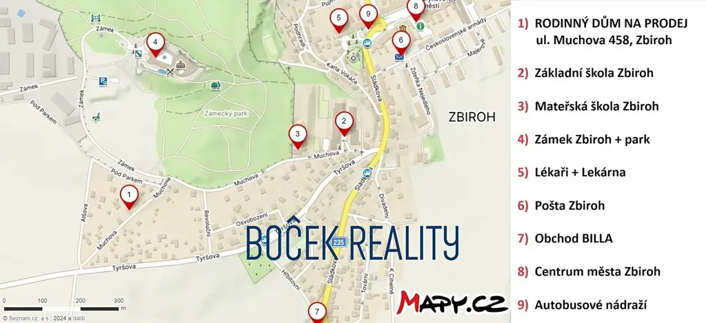 V zastoupení majitele nabízíme k prodeji víceúčelový rodinný dům o dvou bytových jednotkách a technickém prostoru ve městě Zbiroh, ul Muchova. Součástí domu je i pozemek s výměrou 1.171 m2. Hlavní stavba dvoupodlažního rodinného domu s podsklepením byla postavena a kolaudována v roce 1979. V roce 2006 byla k domu přistavěna zimní zahrada Dále v roce 1992 byl k domu přistavěn technický prostor o výměře 100 m2 s možností využití jako garáž, dílna, sklad nebo obchod. V letech 2002 - 2018 prošel dům rozsáhlou rekonstrukcí přízemí a podkroví. Současná dispozice domu: PŘÍZEMÍ byt 1 - obývací pokoj, kuchyně se spíží, ložnice, koupelna s WC, šatna, předsíň a chodba. PODKROVÍ byt 2 - obývací pokoj s kuchyňským koutem, 2x ložnice, koupelna s WC, chodba a terasa. Vytápění domu je zajištěno centrálně kotlem na tuhá paliva s rozvodem do radiátorů a krbem v přízemí. Voda je řešena veřejným vodovodem a vlastní studnou sloužící k zalévání zahrady. Na pozemku se dále nachází zahradní domek, skleník, koupací jezírko a venkovní terasa s krbem. Nemovitost k trvalému bydlení s možností podnikání se nachází ve velmi klidné lokalitě města Zbiroh s veškerou občanskou vybaveností v těsné blízkosti zámku Zbiroh se zámeckým parkem a okolními lesy. Doporučujeme prohlídku.
