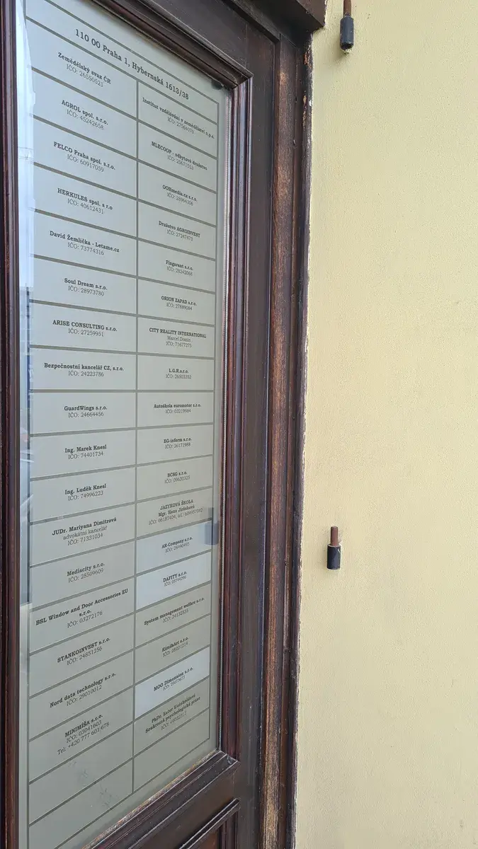 Ve vstupní hale budovy je k užívání vlastní poštovní schránka, zvonek atd.....Grafickou podobu umístění informační tabule o rozměrech 81,5 x 5,8 cm na lištách umístěné ve foyer domu Hybernská - najdete na jedné z vložených fotografií.