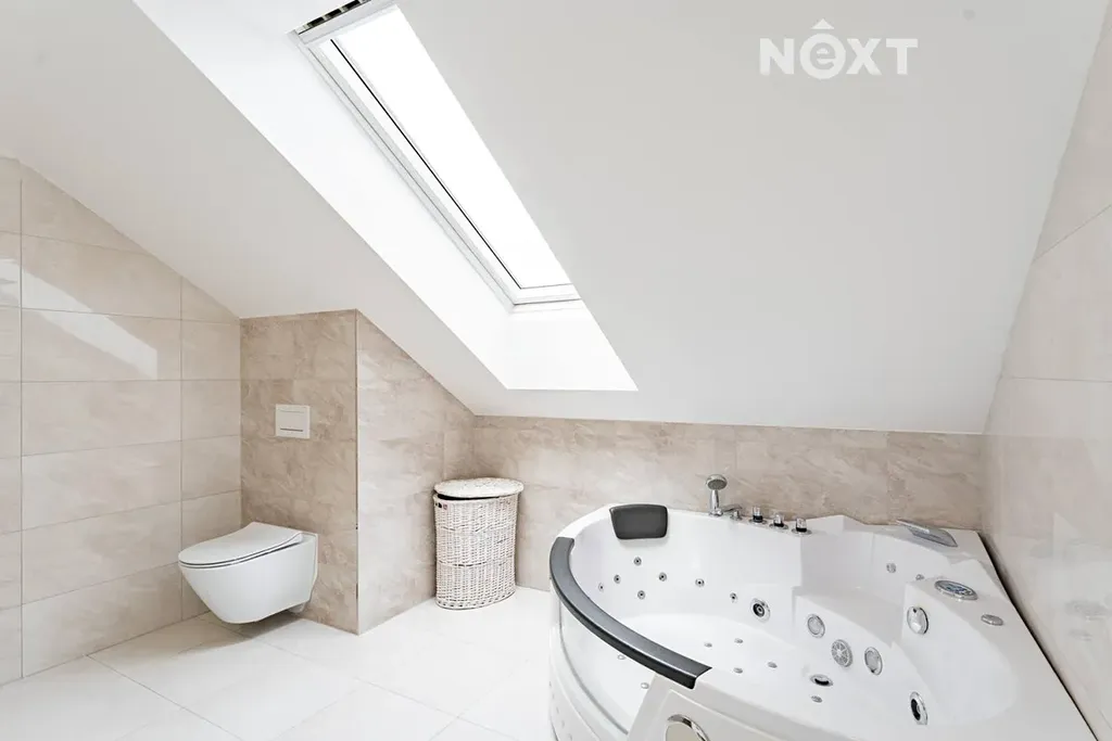 Ve druhém podlaží najdete klidovou zónu, a to tři neprůchozí pokoje, přičemž hlavní ložnice má vlastní šatnu. Dále koupelnu s vířivou vanou, toaletou a skříňkou se dvěma umyvadly - vše navrženo pro maximální komfort rodiny.
