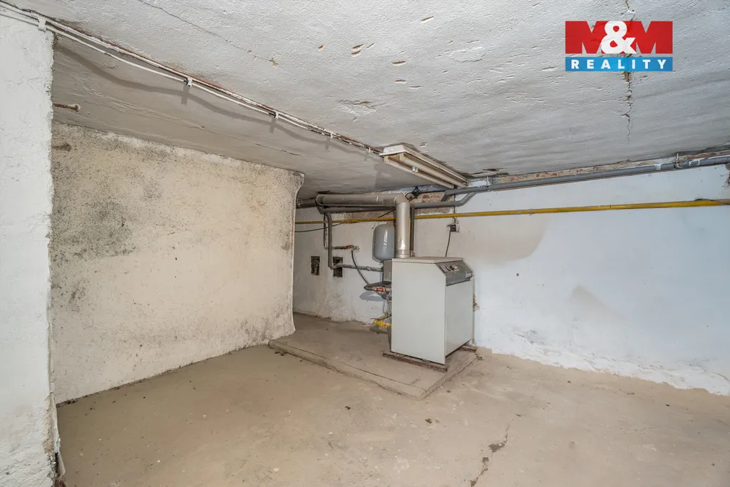 Vytápění zajištuje plynový kotel umístěný ve sklepě.