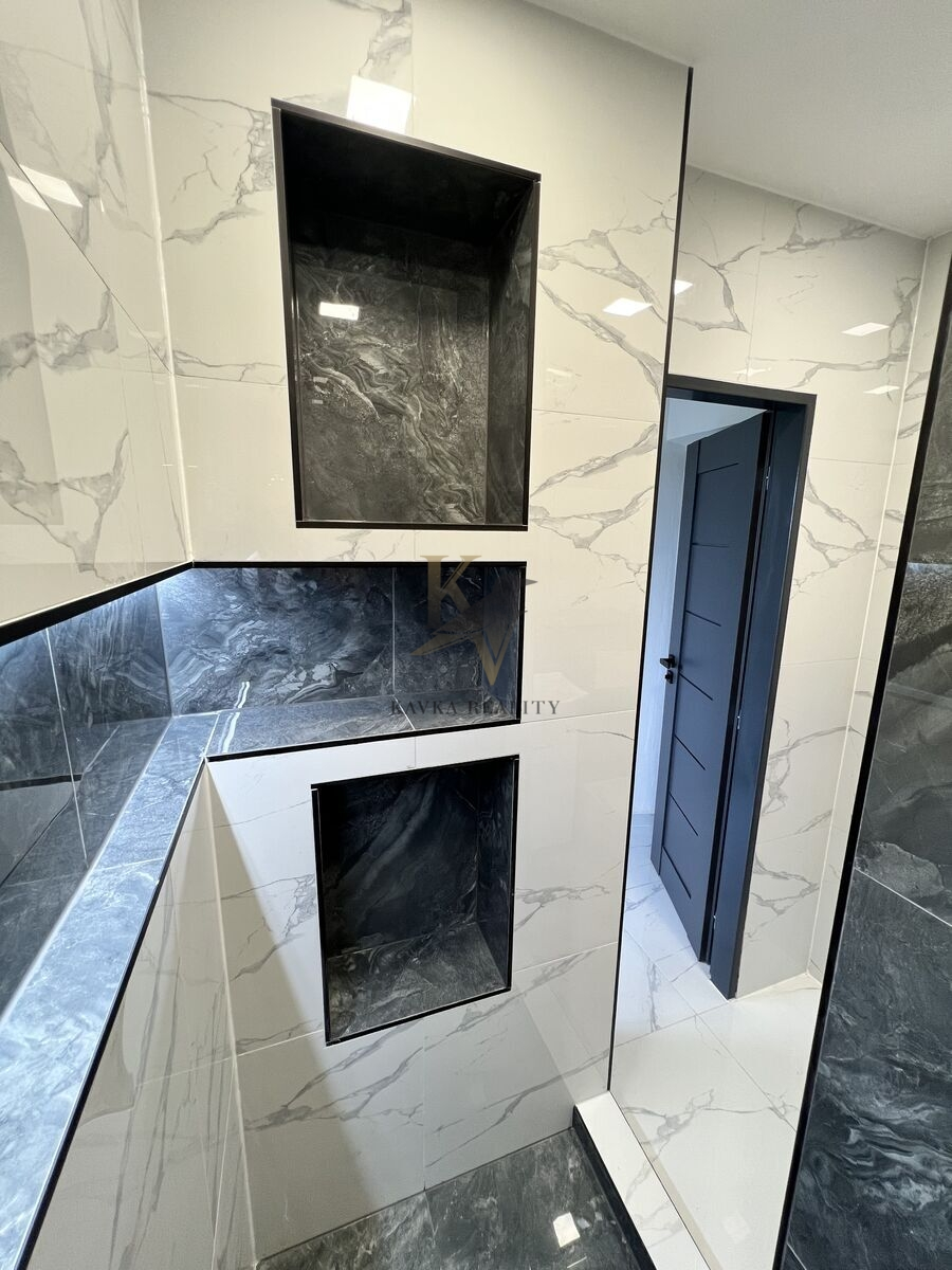 Je po kompletně moderní a nadčasově krásné rekonstrukci včetně nové kuchyňské linky s elektrospotřebiči ( sklokeramická varná deska s vestavěnou horkovzdušnou multifunkční troubou a odsavačem par vše kvalitní značky Gorenje a Whirlpool . ) Celá kuchyňská linka je v pěkném podsvícení , zabudovaného led pásku, který mění barvy. Koupelna a WC je zděná- rekonstruovaná- kde se nachází velký zděný sprchový kout osvětlený nikou s dekorativními policemi , ( ve sprše většinou poslouží jako neocenitelný úložný prostor pro šampon nebo sprchový gel, ve stěnách mimo ně slouží spíše jako police a má funkci dekorační – krásně se tady budou vyjímat květiny nebo třeba suvenýry z cest, či ručníky .) hranaté umyvadlo se skříňkou a zrcadlo zapuštěné v obkladu . Wc je závěsné značky Geberit . Krásná a kvalitní mramorová dlažba se nachází v kuchyni , chodbě v koupelně a na Wc . Ve zbylém pokoji se nachází plovoucí podlaha .