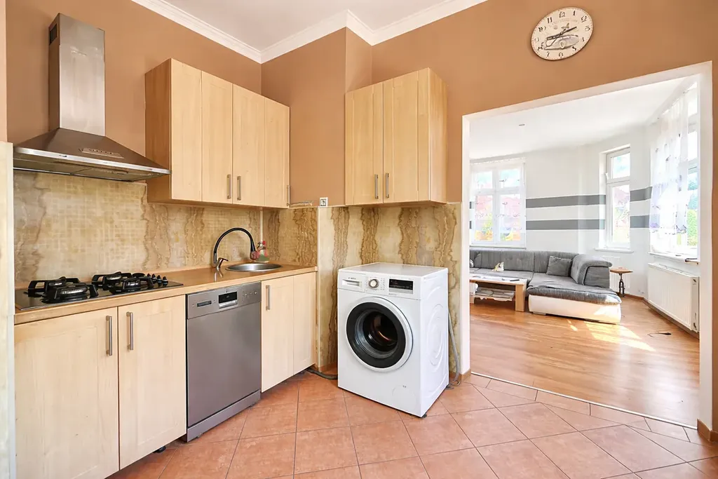 Bytová jednotka je částečně vybavena - plynovou varnou deskou, elektrickou troubou, myčkou sporákem, koupelna je vybavena toaletou a vanou.