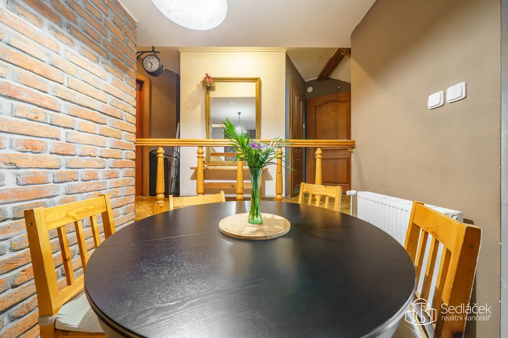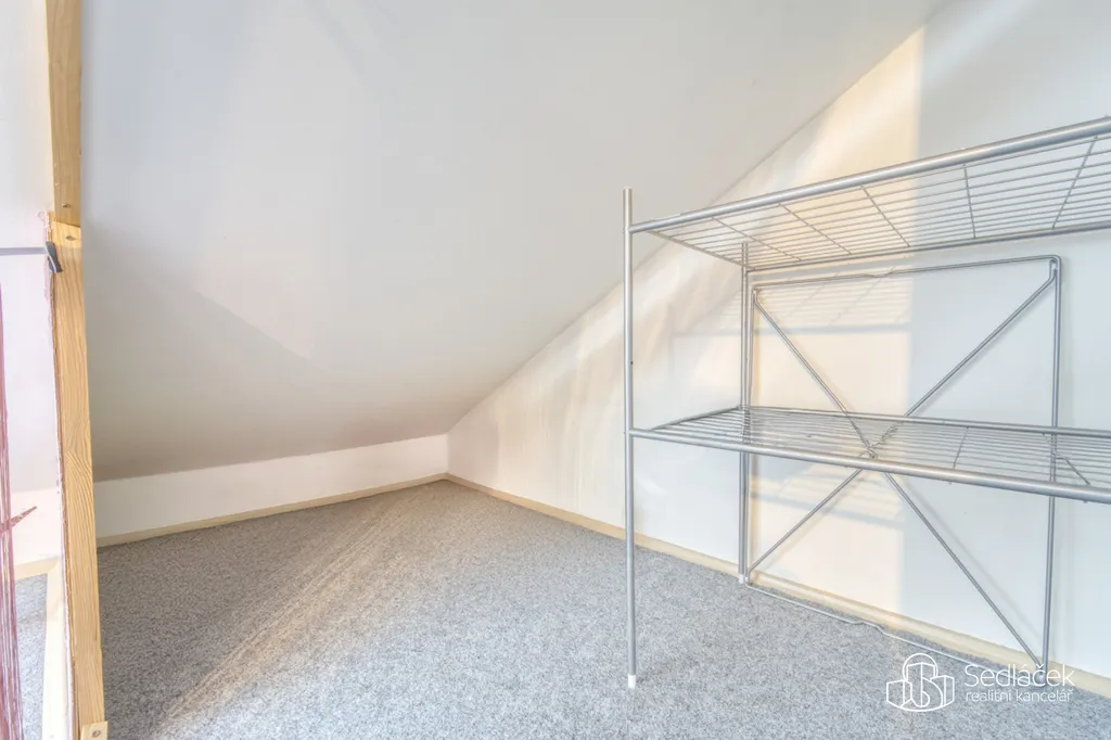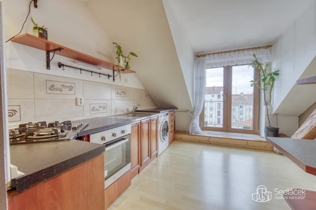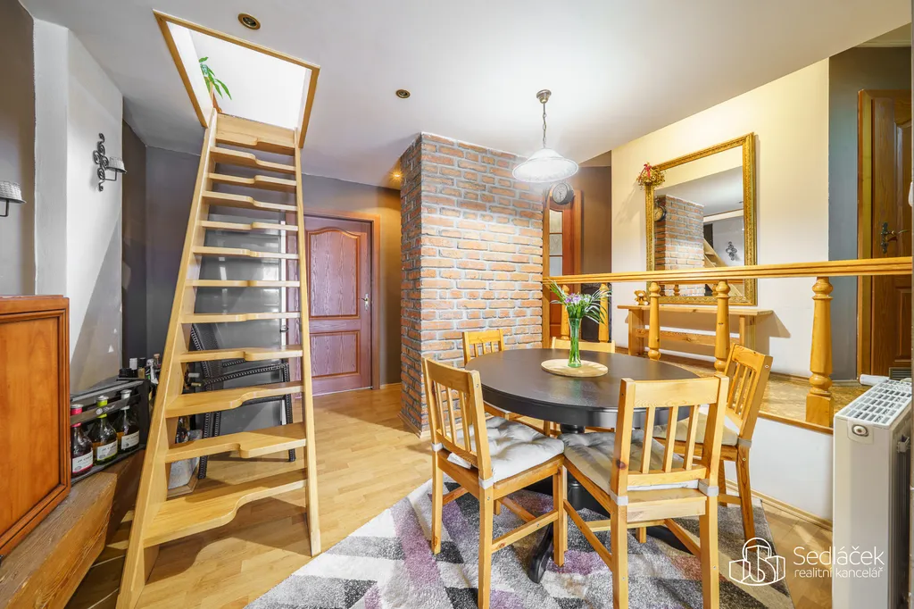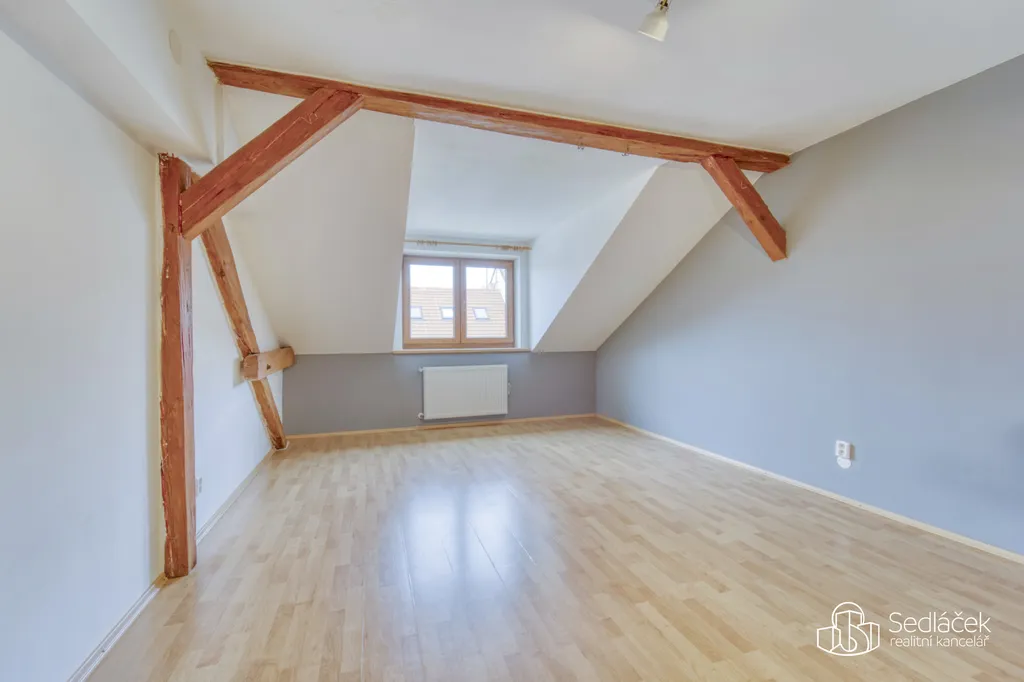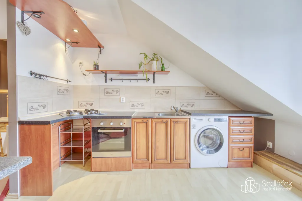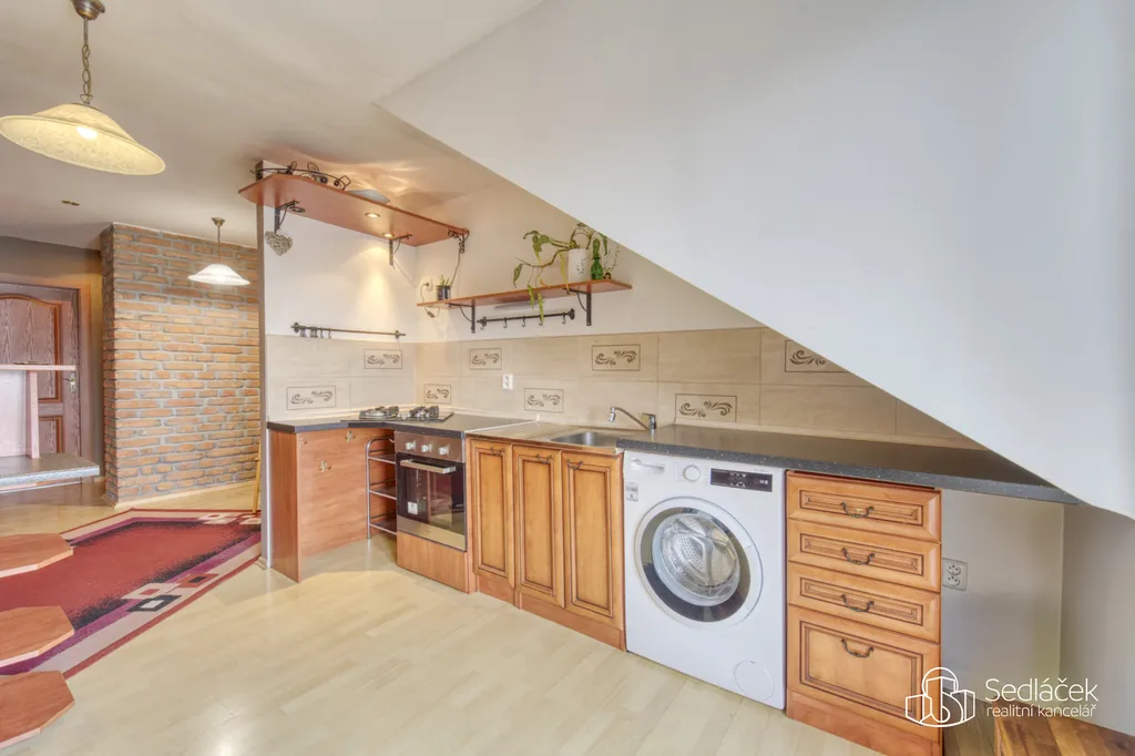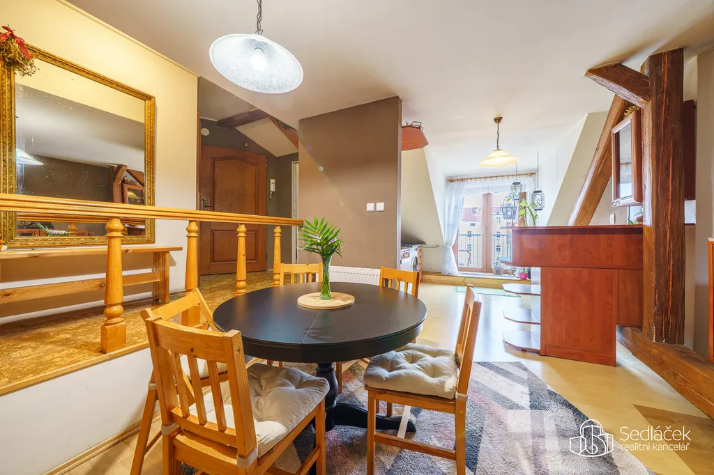 Dispozice bytu nabízí kuchyň s jídelním koutem, dva neprůchozí pokoje a nadstavbový prostor přístupný po dřevěných schodech, vhodný jako dětský kout, herna či spaní. Interiér podtrhuje kombinace pohledových trámů, korkových podlah a střešních i klasických oken, díky nimž má byt jedinečný charakter. Prostorná koupelna disponuje vanou i sprchovým koutem. Vytápění je řešeno kondenzačním plynovým kotlem.