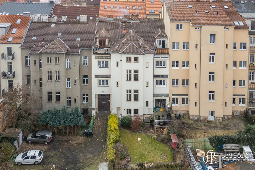 Velkou výhodou domu je společný dvorek, ideální pro posezení nebo klidné odpoledne. Dalším benefitem je docházková vzdálenost do centra Plzně – při svižné chůzi jste tam zhruba za deset minut.
