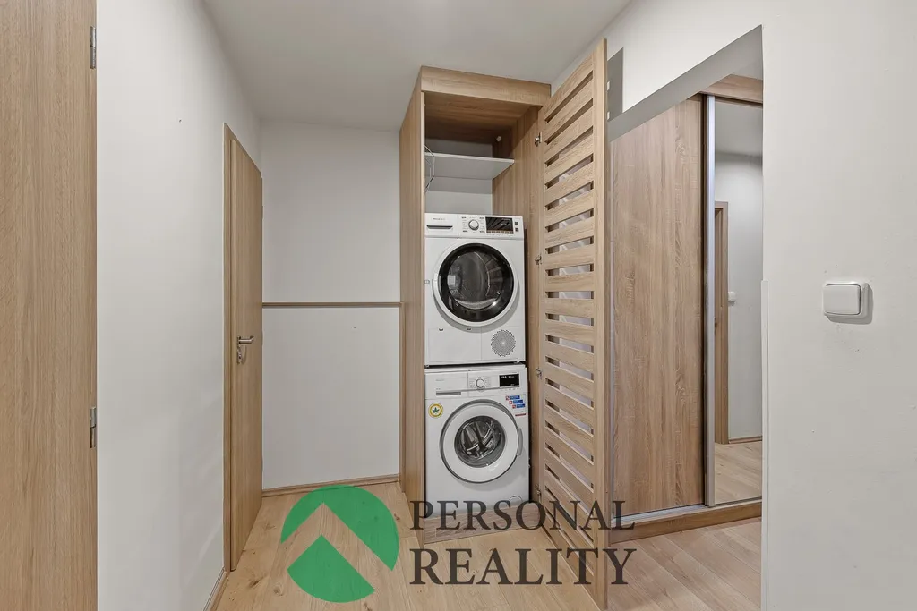 • Chytré úložné prostory: Prostorná chodba je vybavena vestavěnými skříněmi s velkou kapacitou. Součástí je také speciální skříň pro pračku a sušičku, díky čemuž jsou tyto spotřebiče esteticky skryté a koupelna zůstává volná a vzdušná.