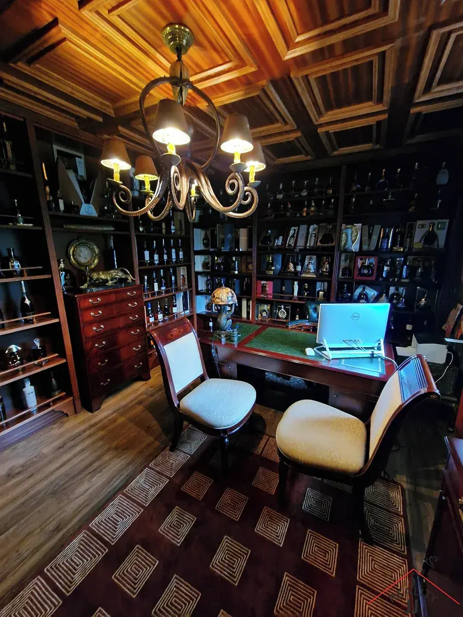 V přízemí se nachází prostorný obývací pokoj, pracovna, kuchyň s jídelnou, odpočinková část s krbem, dvě samostatné toalety a dvě technické místnosti.Vysoké stropy a výhled do zahrady přes ručně vyráběné vitráže dodávají interiéru výjimečnou atmosféru. Z největší místnosti v přízemí je několik vstupů na zahradu a velkou terasu (40m2),která může být přebudována na zimní(krytou).