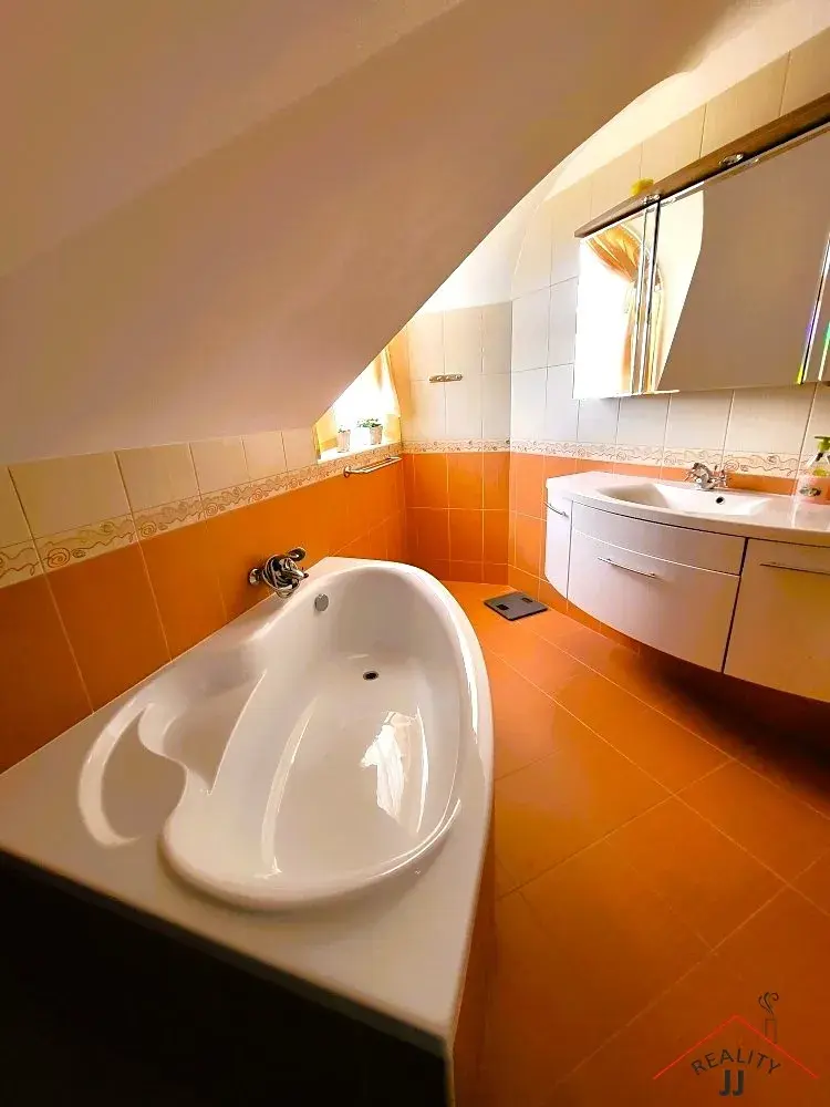 V prvním patře domu je velký dětský pokoj s vlastní koupelnou a WC, hlavní ložnice s vlastní šatnou, vanou a WC. Dále je pak samostatná část prohosty se dvěma jednolůžkovými pokoji, jednou dvoulůžkovou ložnicí a koupelnou s vanou a WC.