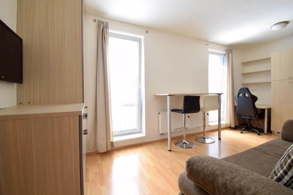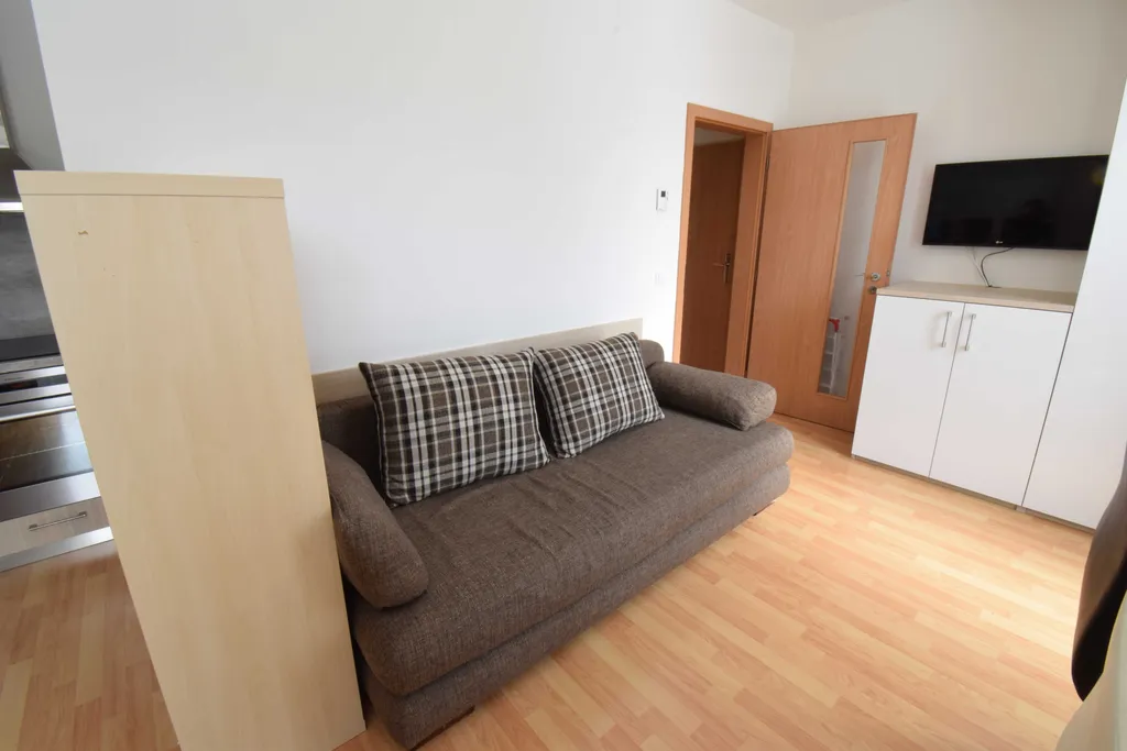 Byt o celkové výměře 30 m² se nachází v 1. podlaží udržovaného cihlového domu s výtahem a součástí podnájmu je také sklep. Byt se nabízí částečně vybavený, přičemž veškeré vybavení viditelné na fotografiích zůstává k dispozici. Kuchyňská linka je vybavena lednicí, mikrovlnnou troubou, elektrickou troubou, varnou deskou, digestoří a pračkou. V obytné části se nachází pohovka, pracovní stůl se židlí, barový stůl s židlemi, komody a televize. Koupelna je nová a moderně řešená, se sprchovým koutem, umyvadlem a toaletou.