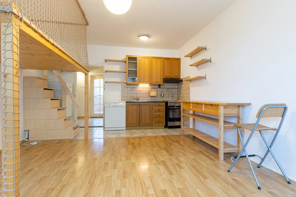 Byt se nabízí částečně vybavený. Součástí kuchyňské linky je lednice, myčka, trouba, sporák a digestoř. V obývací části je komoda, židle a praktické spací patro. Ložnice je zařízená šatní skříní a patrovou postelí. Koupelna disponuje sprchovým koutem, umyvadlem a toaletou.
