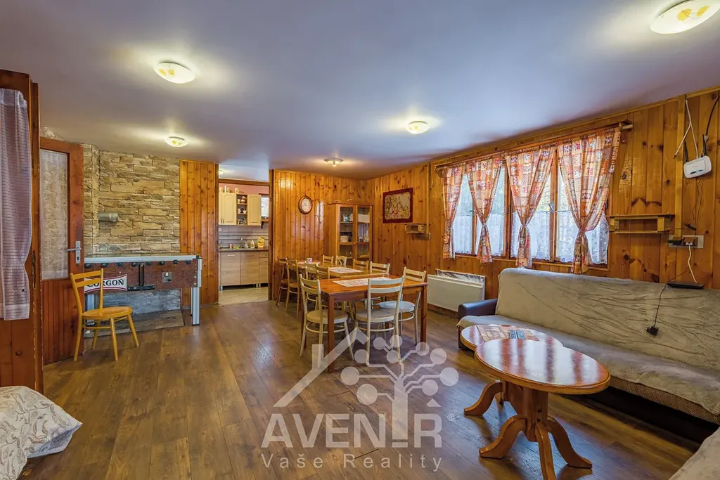 Společenská místnost s kuchyní Vás v nadzemním patře přivítá svojí horskou atmosférou a nabídne teplo útulného domova, i když třeba jen dočasného, než přivítá další a další hosty.