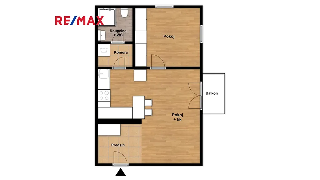 Ta je vybavena kvalitními spotřebiči - digestoř, indukční varná deska, multifunkční el. trouba, mikrovlnná trouba, myčka nádobí a lednice s mrazákem. Z obývacího pokoje je vstup na balkon s výměrou cca 4 m2, a také vstup do ložnice ve které je umístěna vestavěná šatní skříň s dostatkem úložného prostoru.