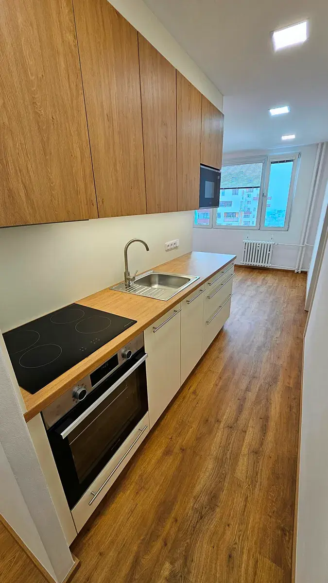 Byt je částečně vybavený – nová moderní kuchyňská linka včetně myčky, nové lednice, indukční desky, elektrické trouby. V bytě je komora, pokoje jsou nezařízené. V koupelně je sprchový kout. WC je samostatné. Po rekonstrukci v bytě ještě nikdo nebydlel.