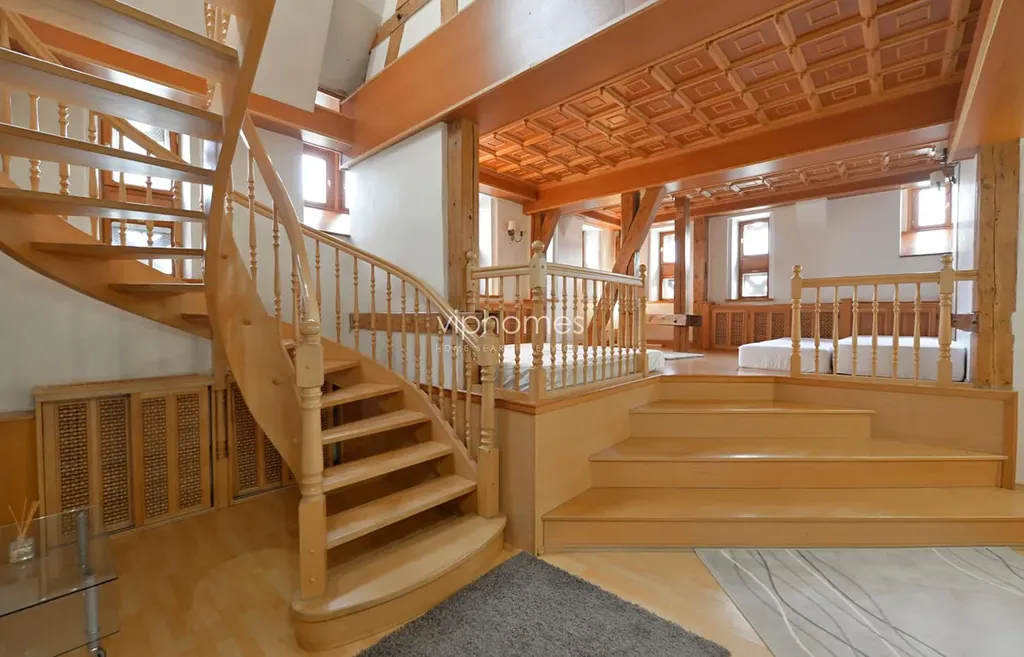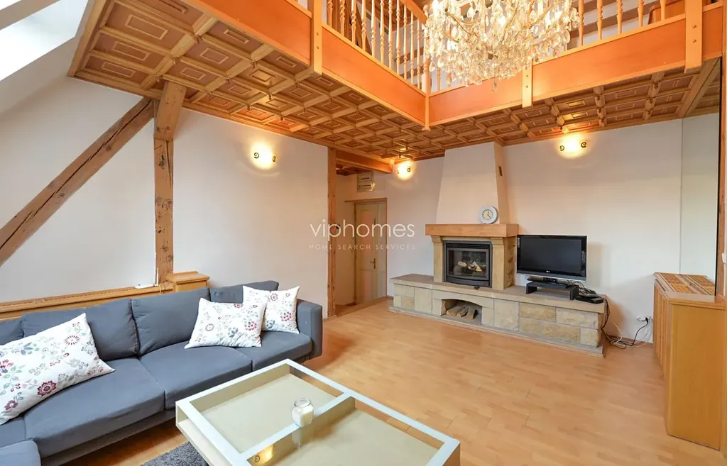 V přízemí je kompletně vybavena kuchyň s přístupem na balkon, obývací pokoj s dvojitou výškou stropu, hlavní ložnice s šatnou a plně vybavenou koupelnou s vířivkou a saunou. V patře je umístěna druhá ložnice. Optickou dominantou přízemí je nepochybně schodiště. Obývacímu pokoji vévodí stylový krb, v bytě je moderní kuchyňské a koupelnové vybavení. Výhled na Pražský hrad a Staré Město.