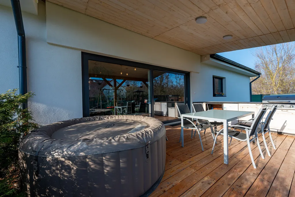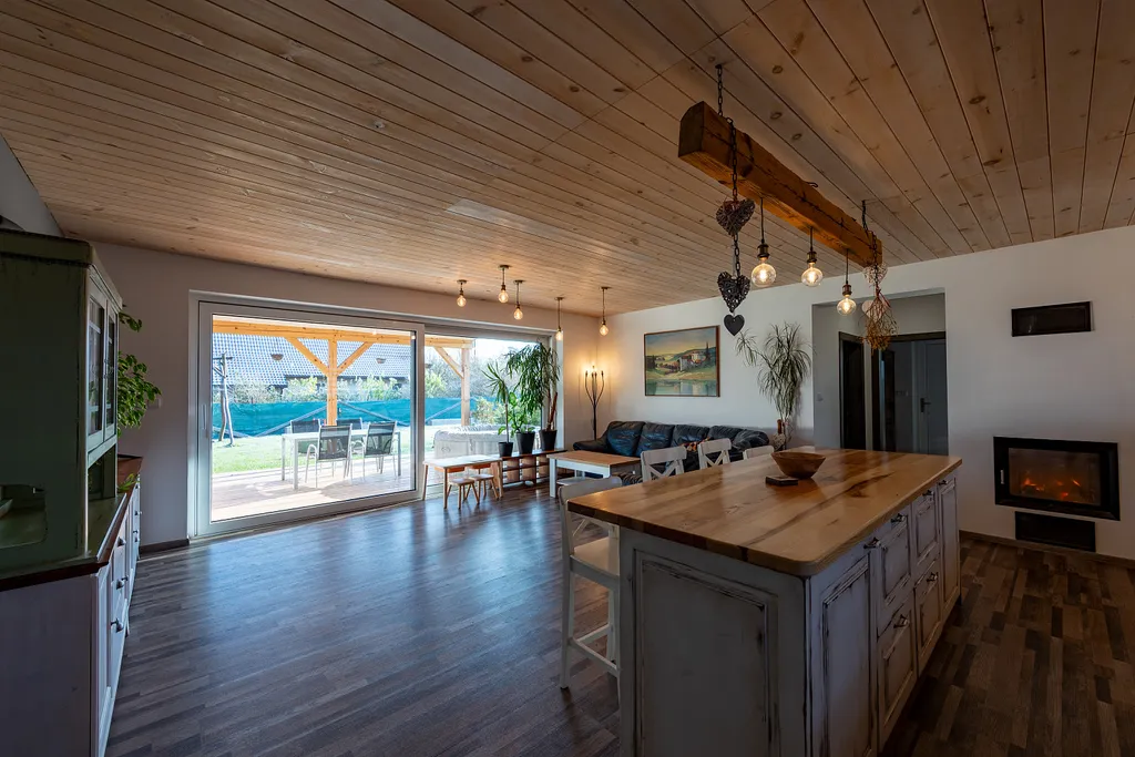 Topení a ohřev teplé vody je zajištěn tepelným čerpadlem, dále je pak v obývací místnosti umístěna krbová vložka.