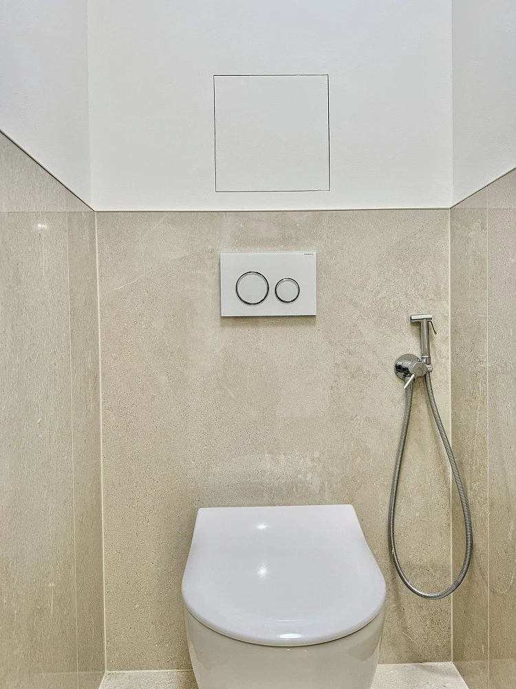 Byt nabízí vysoce nadstandardní provedení – dřevěná hybridní podlaha, velkoformátové obklady a dlažby v koupelně a na WC, bezfalcové dveře, sanita Villeroy & Boch, baterie Hansgrohe a kompletní elektroinstalace vč. dotykových vypínačů, zabezpečovacího a kamerového systému.