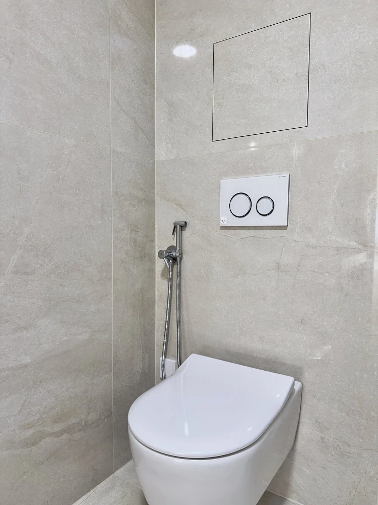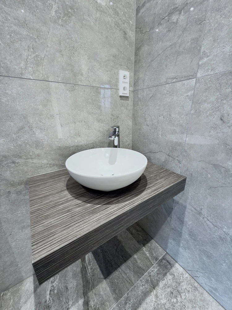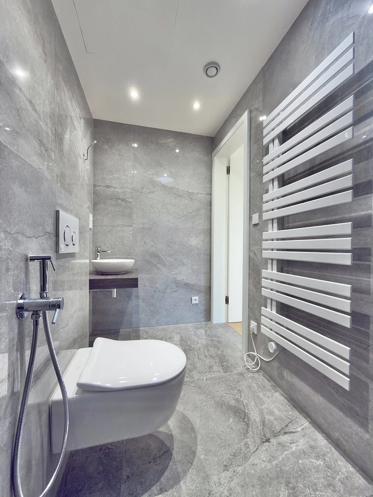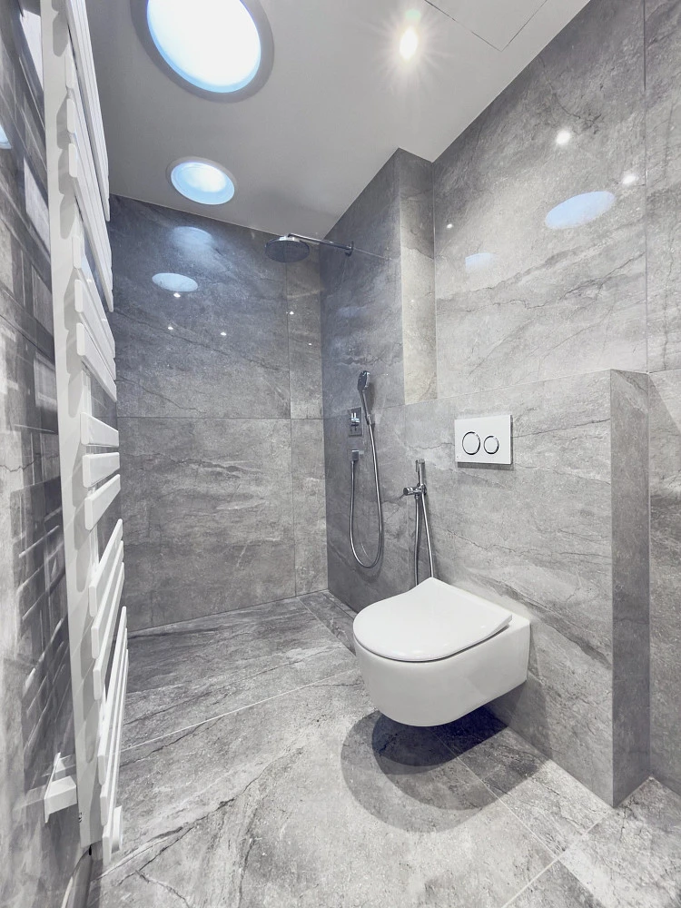 Byt nabízí vysoce nadstandardní provedení – dřevěná hybridní podlaha, velkoformátové obklady a dlažby v koupelně a na WC, bezfalcové dveře, sanita Villeroy & Boch, baterie Hansgrohe a kompletní elektroinstalace vč. dotykových vypínačů, zabezpečovacího a kamerového systému.