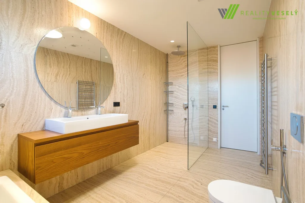 Interiér je navržen s důrazem na praktičnost i estetiku – velkoformátové italské dlažby, kvalitní materiály a promyšlené dispoziční řešení.