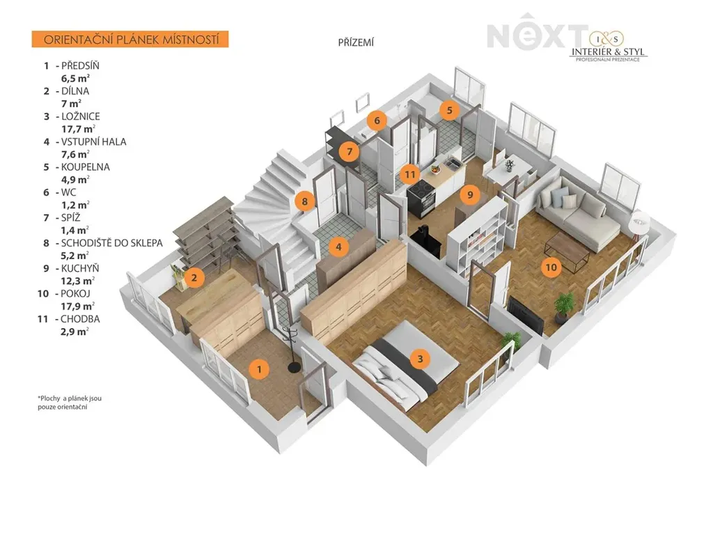 Dispozice domu: v 1.NP. se nachází vstupní chodba (závětří), domácí dílna, předsíň, kuchyň, obývací pokoj, ložnice, koupelna s vanou, samostatné wc, sklad, z předsíně je vstup do sklepa (suterénu domu).