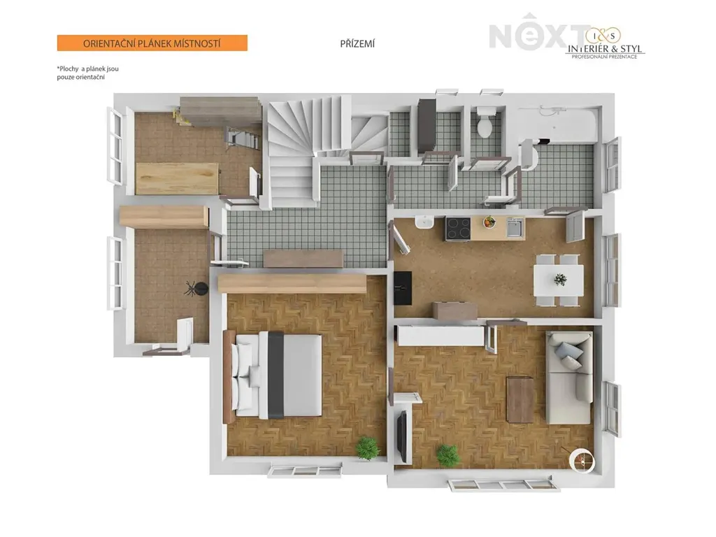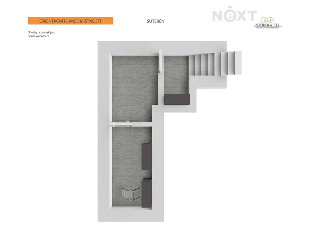 Ve 2.NP. je další bytová jednotka 2+1 (kuchyň, obývací pokoj, ložnice), koupelna a wc, 2 komory a spíž.