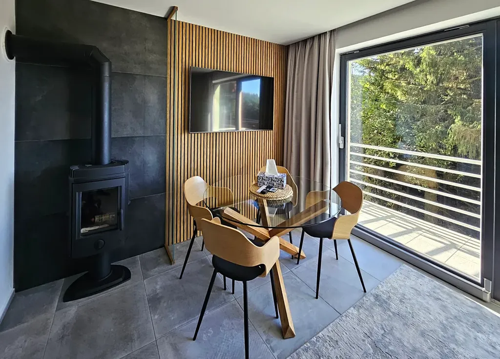 V přízemí apartmánu se nachází obývací pokoj s krbovými kamny, kuchyňský kout s jídelnou a vstupem na terasu, dále vstupní chodba a koupelna s vanou a toaletou. V patře je umístěna hlavní ložnice s výhledem na část Černé hory, chodba s úložnými prostory, druhý pokoj a koupelna se sprchovým koutem a toaletou.