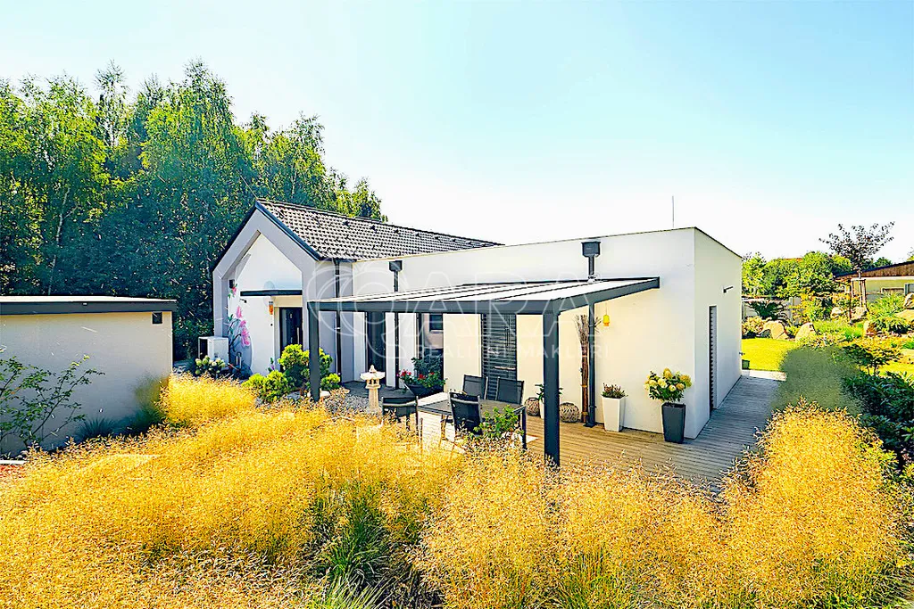 Zprostředkujeme Vám ke koupi moderní, reprezentativní, designový, maximálně funkční vilový bungalov (dřevostavba) s obytnou plochou 145 m2, se zimní a architektonickou zahradou, situovaný v nejprestižnější části Kamenice – Štiřín, v klidové zóně u zámku a golfového hřiště. Tento výjimečný dům je vystavěn na pozemku o celkové ploše 1 205 m2 a byl kolaudován v roce 2023. Dominantou stavby je originální ručně malovaná fasáda od akademického malíře, která domu dodává naprosto jedinečný charakter a činí jej skutečným designovým originálem. Parcela je bez přímých sousedů, vzrostlé stromy vytvářejí přirozené soukromí i mikroklima – ráno vás probudí ticho a zeleň, večer si užíváte jemně nasvícenou zahradu místo pohledů do cizích oken.