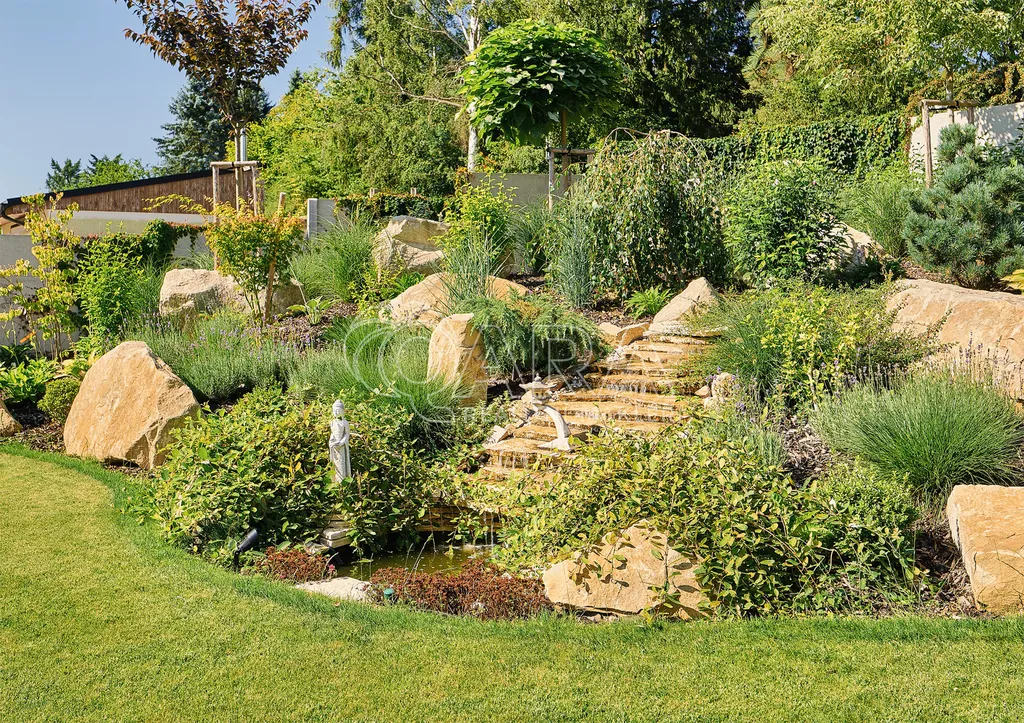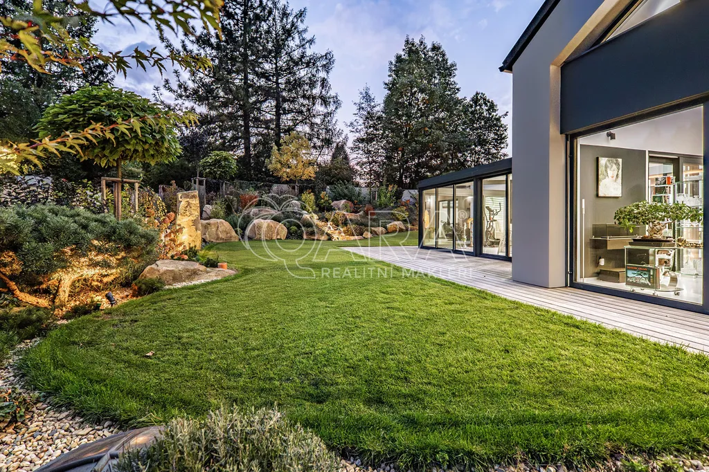 Vodní kaskáda, LED osvětlení, bonsaje a solitérní stromy, terasy, automatická závlaha, profesionální modelace terénu a výsadba zajišťující absolutní soukromí. Celek působí jako soukromý resort.