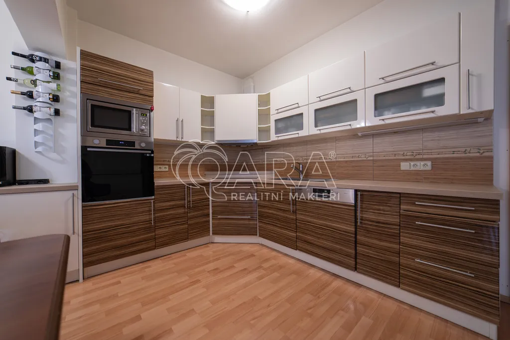 Dominantou bytu je velmi prostorný obývací pokoj přes 40 m2, který je spojený s kuchyňským koutem. Kuchyňská linka je kompletně vybavená vestavěnými spotřebiči. Koupelna a toaleta jsou samostatně přístupné. Pokoje nejsou průchozí. V předsíni se také nachází komora ( šatna) a velká vestavěná skříň.