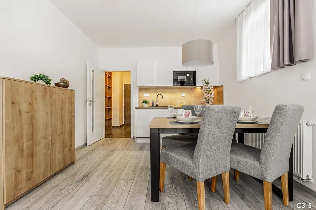 Komfort a vybavení - plně vybavený interiér: kuchyň na míru, vestavěné spotřebiče, kvalitní nábytek, TV, pohodlná postel, sedačka a další, předokenní žaluzie s elektrickým ovládáním pro maximální komfort, balkon orientovaný do klidné zeleně – ideální pro ranní kávu i večerní relax, samostatná komora vhodná pro uskladnění sportovního vybavení, bezproblémové parkování přímo před domem, energeticky úsporný dům (třída B) s tepelným čerpadlem a fotovoltaikou – nízké provozní náklady.