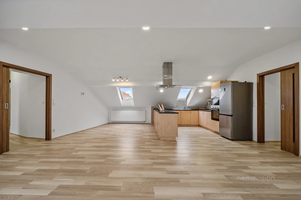 V klidné části Brna – Husovic, na ulici Nováčkova, se nachází výjimečně prostorný a světlý byt 4+kk o celkové ploše 138 m², situovaný v půdní nástavbě bytového domu. Nástavba byla realizována před zhruba 10 lety a byt je ve výborném technickém stavu, připravený k okamžitému bydlení bez nutnosti dalších investic.