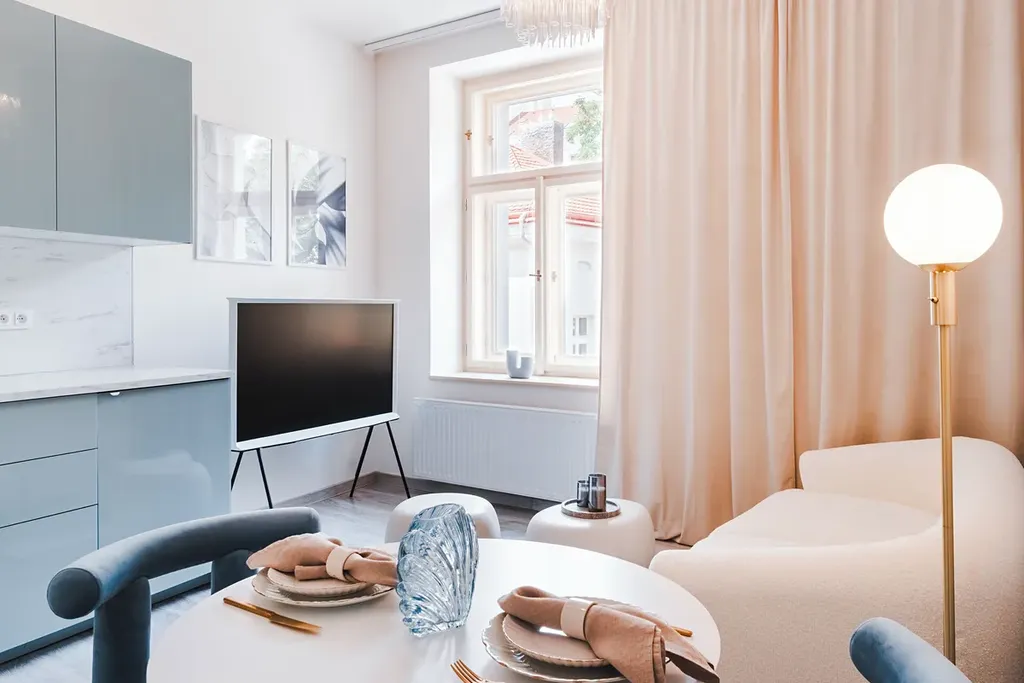 Po vstupu do bytu Vás přivítá prostorná předsíň, ze které je přímý vstup do koupelny vybavené sprchovým koutem, toaletou a pračkou se sušičkou. Následně se dostanete do světlého obývacího prostoru s kuchyňským koutem, kde je moderní kuchyňská linka s vestavěnými spotřebiči - lednice s mrazákem, myčka, trouba, indukční varná deska a další vybavení.