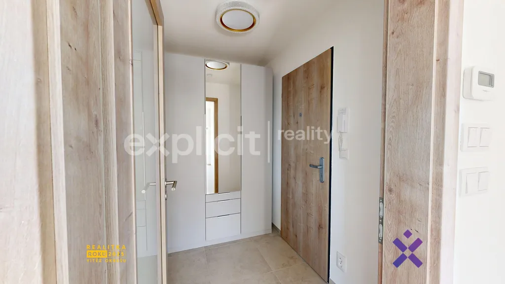 Obytná místnost s kuchyňským koutem je vybavena kuchyňskou linkou s troubou, elektrickou varnou deskou a digestoří. V zádveří se nachází praktická vestavěná šatní skříň. Koupelna disponuje sprchovým koutem, toaletou a přípravou na připojení pračky a sušičky. O příjemné klima v bytě se stará podlahové vytápění a klimatizační jednotka.