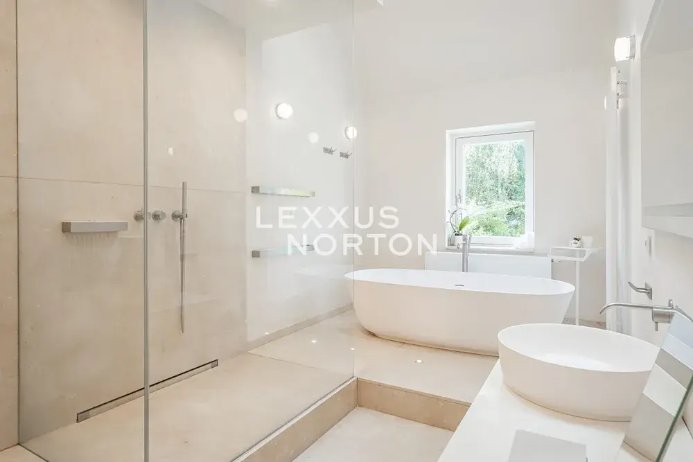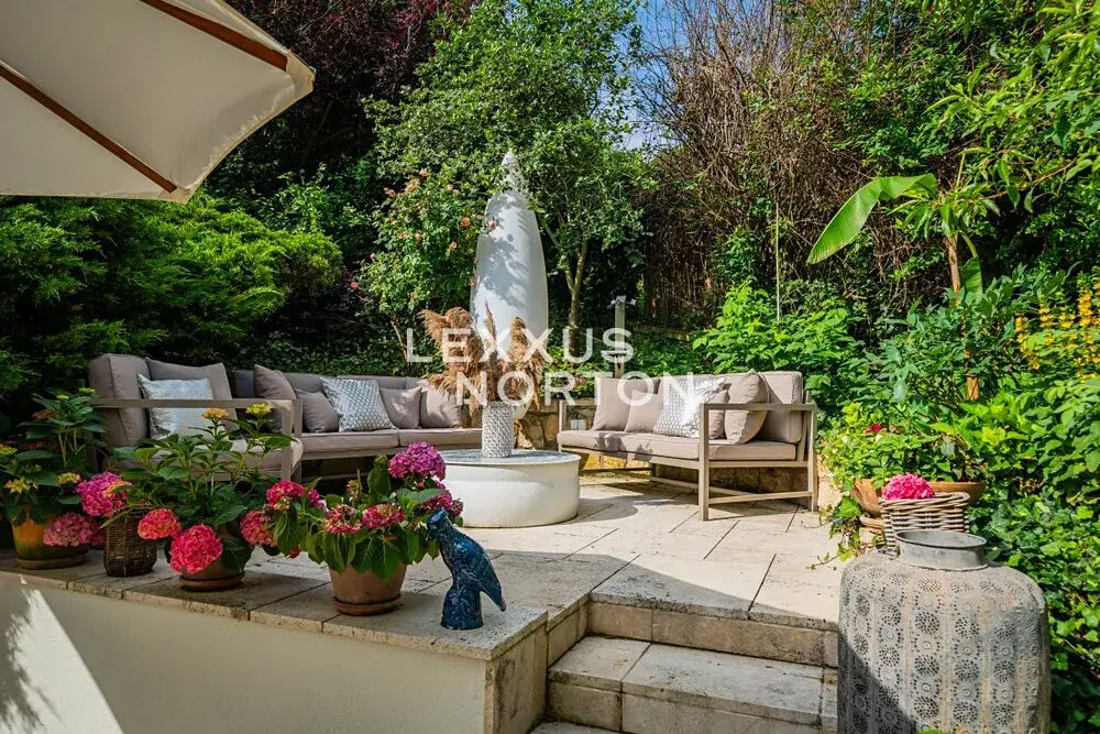 Při rekonstrukci byl kladen důraz na přírodní materiály a propojení interiéru s exteriérem. Travertin, masivní dřevo, vzrostlé stromy, okrasné keře, exotické palmy — vše tvoří harmonickou zahradní oázu, která nabízí klid a soukromí po celý rok. Na pozemku je také prostorný zahradní dům s vytápěním a elektřinou.