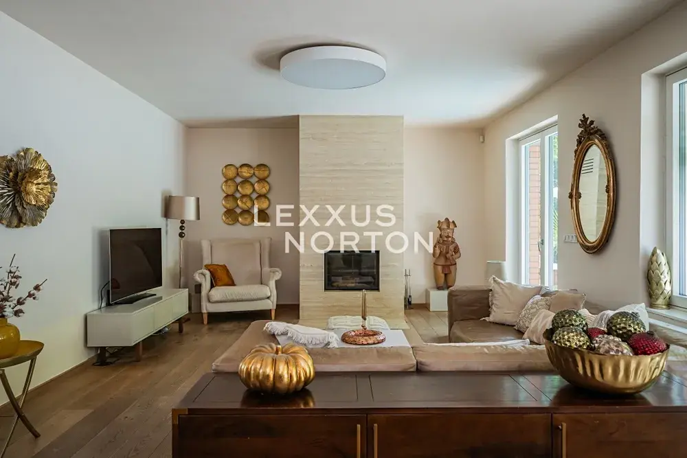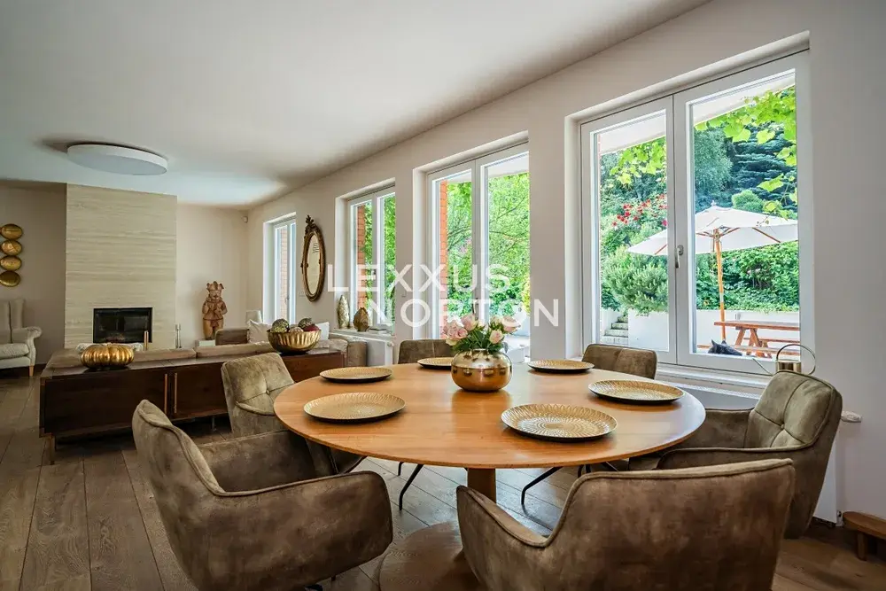 Hlavní vstupní hala plynule přechází do velkorysého obývacího pokoje (47,2 m²) s krbem obloženým travertinem a francouzskými okny vedoucími na terasu a bazén. Moderní kuchyně LEICHT s barovým pultem z přírodního travertinu citlivě odděluje jídelní část a nabízí výhled do klidné ulice.