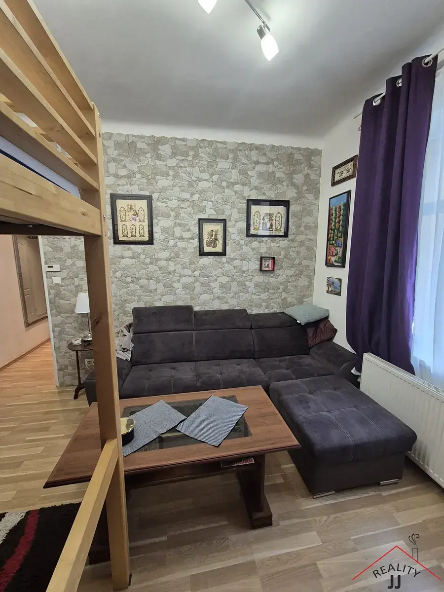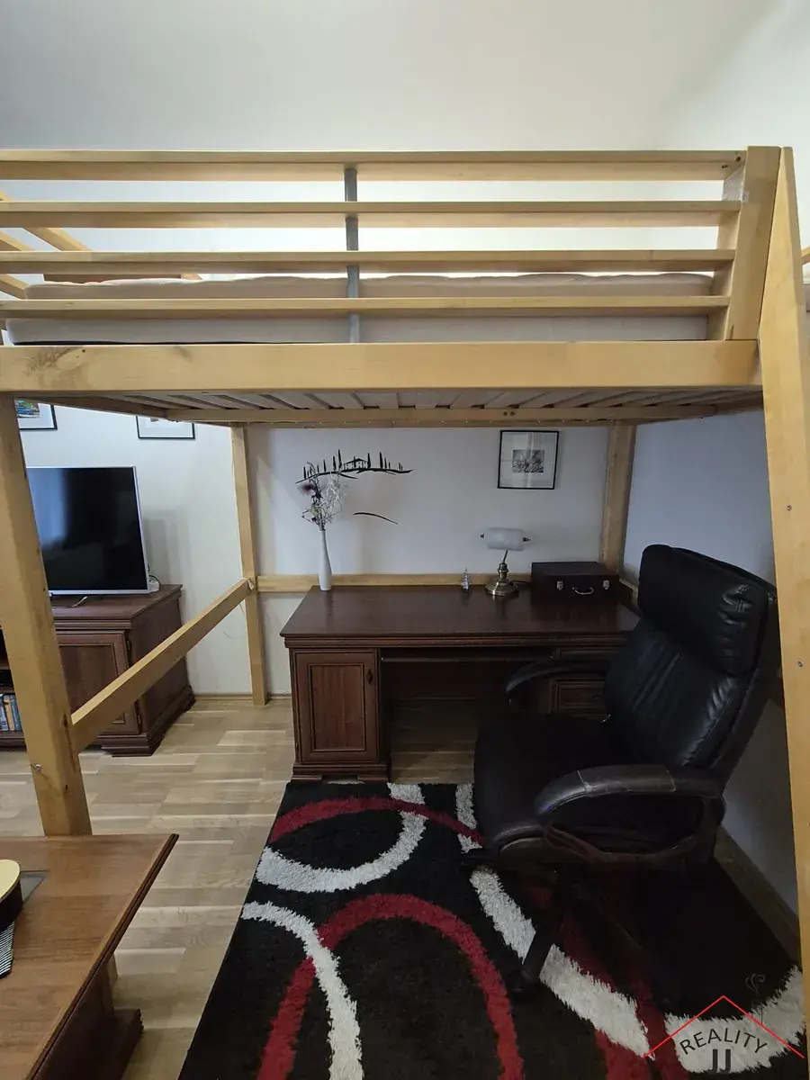 Vstupujeme chodby do druhé – největší místnosti bytu- do obývacího pokoje, který zároveň slouží jako jídelna,ložnice i pracovna. Bývací pokoj je kompletně zařízen novým nábytkem.Je zde praktická patrová postel s prostorem pro pracovní kout s psacím stolem.