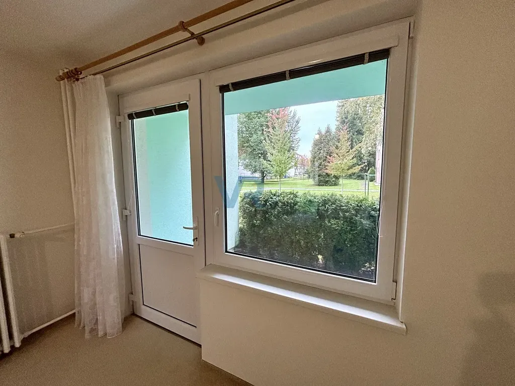 Obývací pokoj disponuje balkonovými dveřmi vedoucími na předzahrádku ohraničenou nízkým plůtkem a vysazenými tújemi.