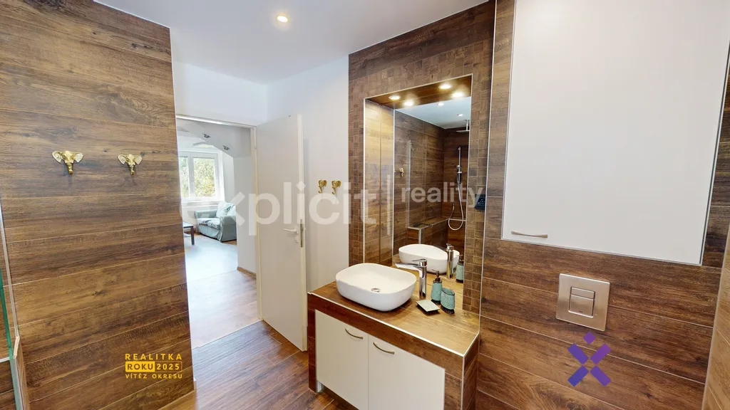 Prostorná koupelna se sprchovým koutem je společně s toaletou sloučena dohromady. Součástí vybavení koupelny je i pračka a sušička.
