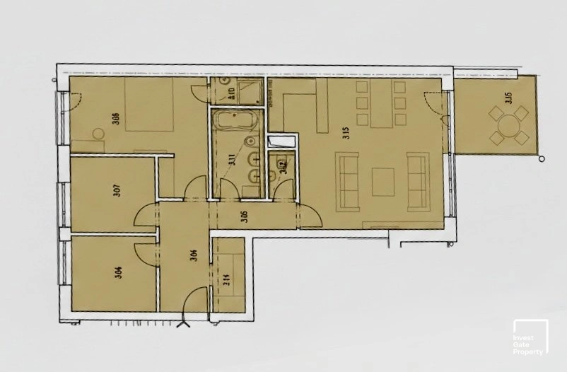 Celková plocha bytu činí 95m2 a skládá se z obývacího pokoje s kuchyňským koutem, ze kterého se vstupuje na prostornou terasu směřující do vnitrobloku. Dále ze tří pokojů, předsíně, praktické komory hned u vchodových dveří v předsíni. Byt má dvě koupelny - jedna s vanou a druhá se sprchovým koutem přístupná přímo z ložnice, koupelny mají podlahové topení. Byt má dvě WC jedno je samostatné a druhé je přímo v koupelně. K bytu dále patří sklep přímo na patře. V prodejní ceně bytu je nábytek, který je na fotografiích.