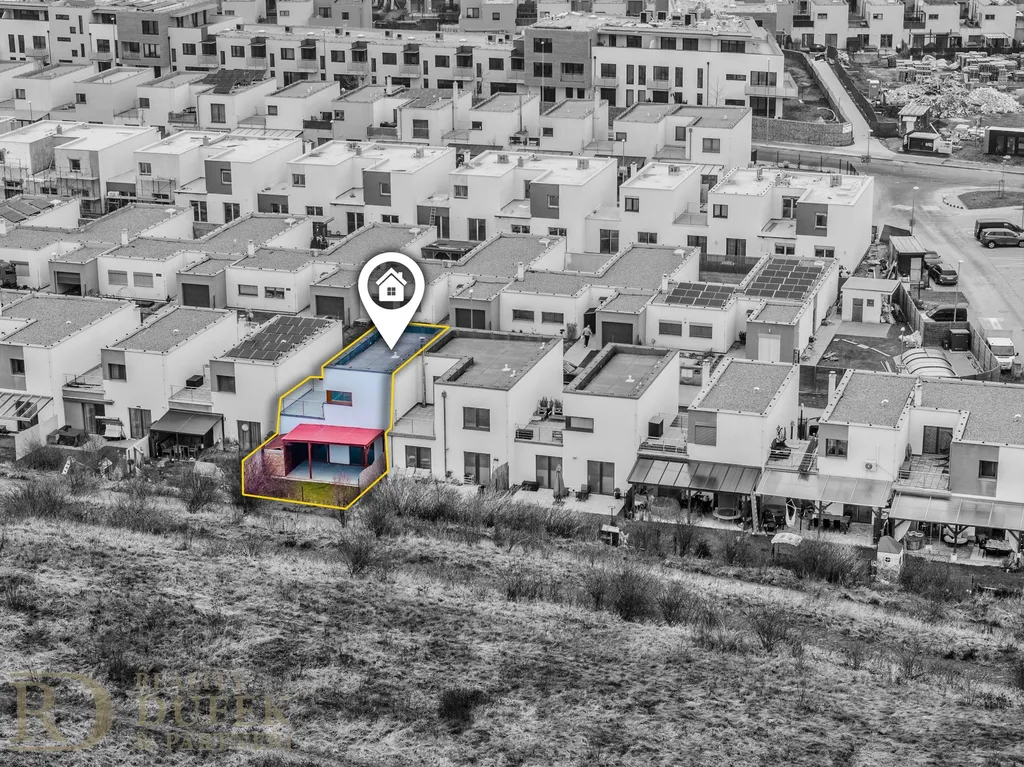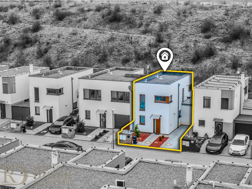 Součástí domu jsou dvě terasy, z nichž jedna plynule navazuje na menší zahradu s příjemným výhledem do zeleně, která nabízí klidné místo pro relaxaci, posezení nebo rodinné aktivity. K nemovitosti náleží také dvě venkovní parkovací stání.