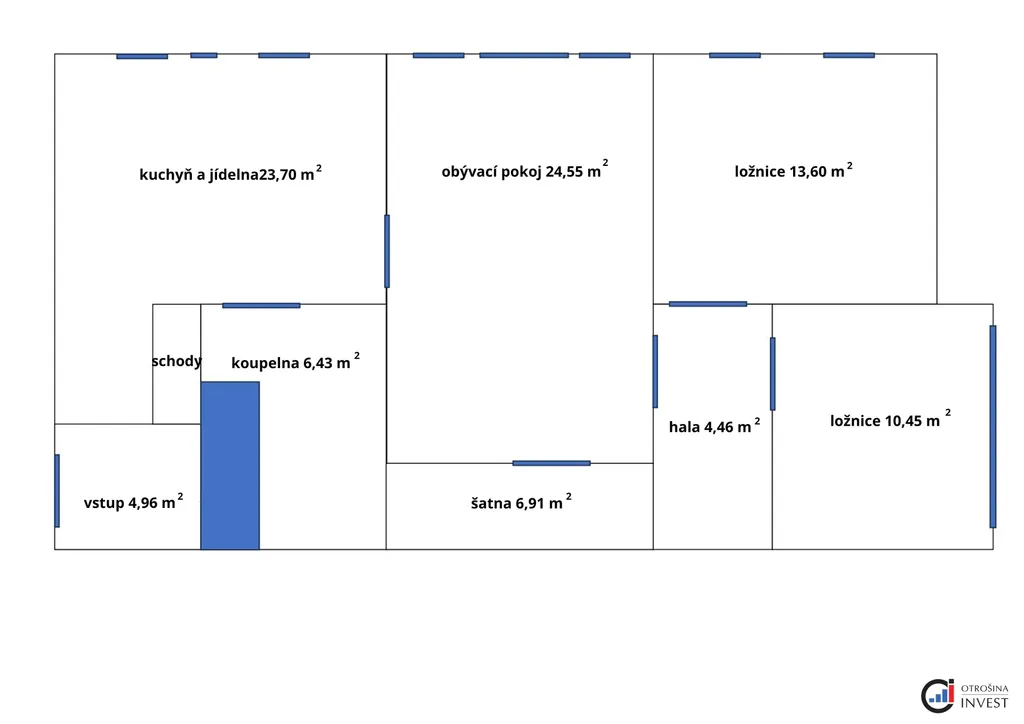 • Byt se skládá ze 2 ložnic, obývacího pokoje s šatní skříní, kuchyně s jídelnou, koupelny a předsíně.