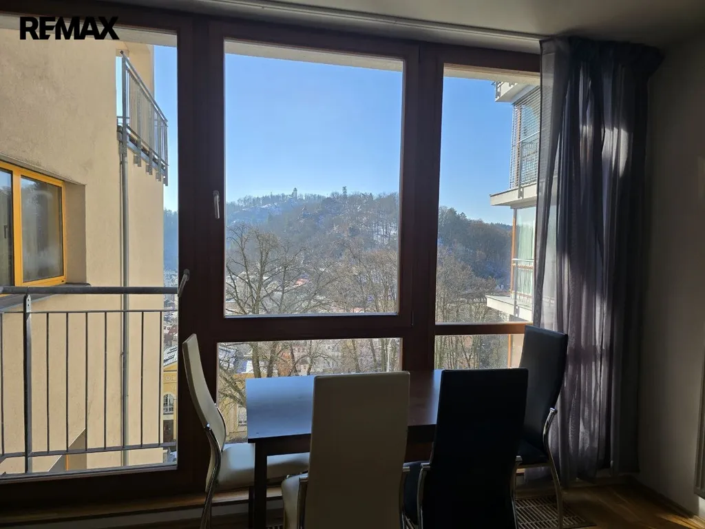 Dominantou bytu je prostorný obývací pokoj s kuchyňským koutem a výhledem na Karlovy Vary, který interiéru dodává světlo, otevřenost a příjemnou atmosféru.