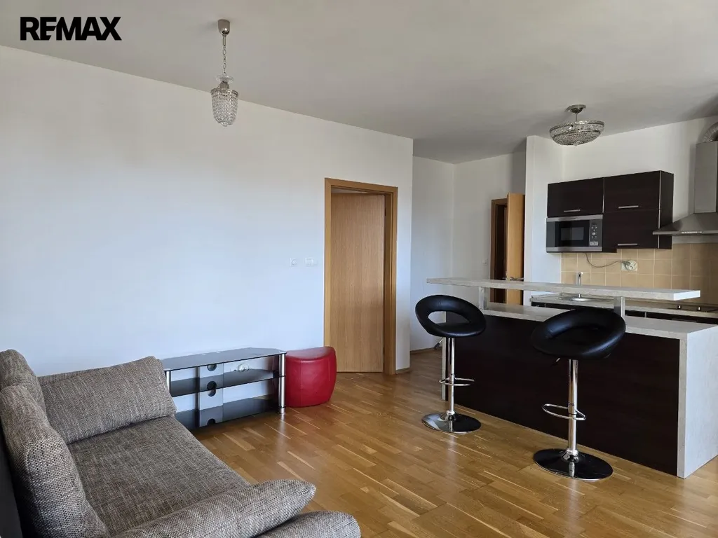 Součástí bytu je kuchyňská linka vybavená spotřebiči (myčka nádobí, pračka, mikrovlnná trouba).