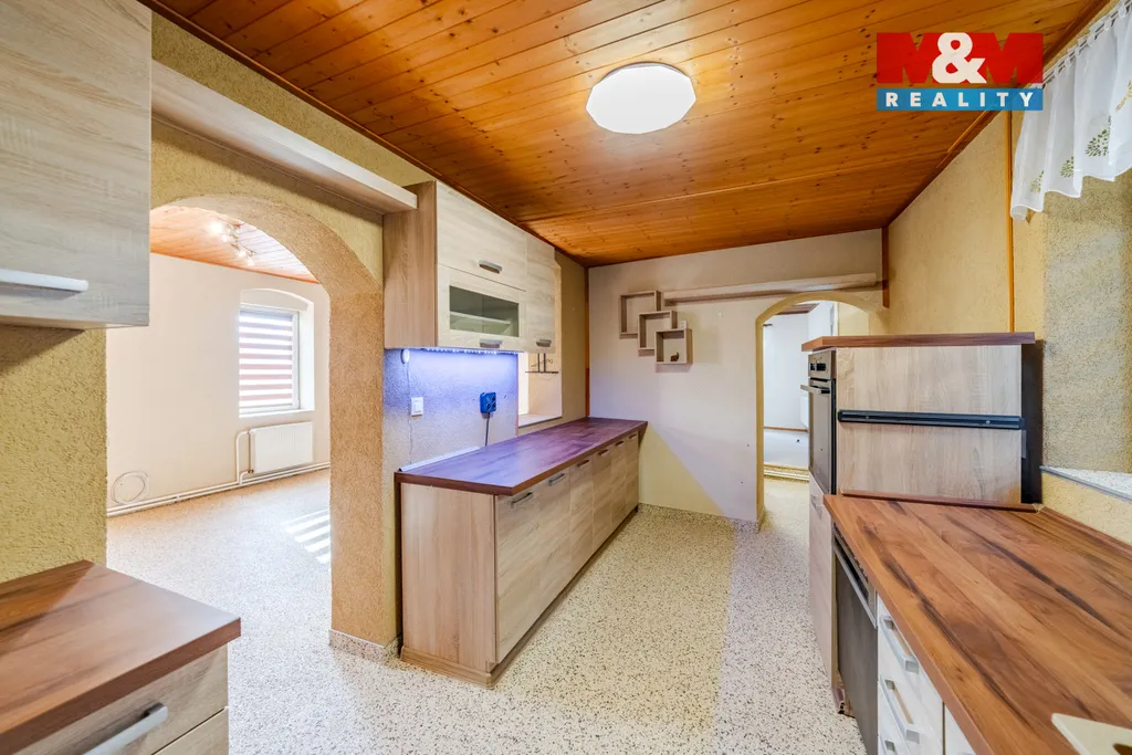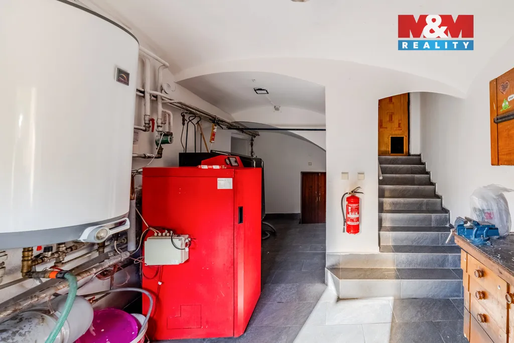 V patře se nachází bytová jednotka 3+1 se špajzem. Po schodech se vstupuje do dílny s kotelnou, kde je umístěn kotel na peletky s automatickým dávkovačem, menší sklep a místnost určená k uskladnění peletek.