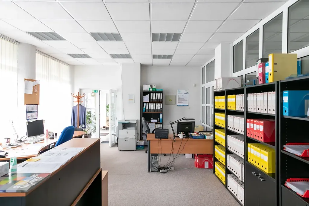 1.NP - přízemí (300m2): hlavní vstup z ulice, recepce, kanceláře, sklady a parking ve dvoře