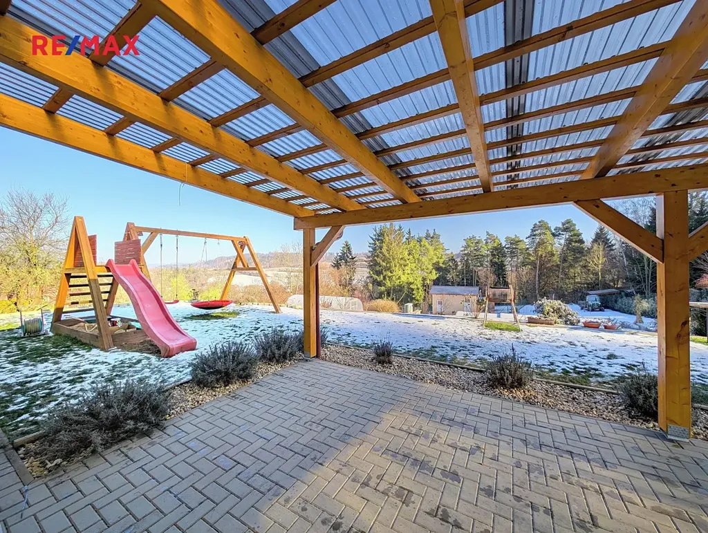 Pozemek je svažitý se sklonem k východu, oplocený a poskytuje vysokou míru soukromí. K dispozici je terasa cca 54 m², krytý vyhřívaný bazén 18 m² se slanou vodou a protiproudem, zahradní domek 20m², skleník 3×6 m, vyvýšené záhony, hospodářské zázemí, přístřešek, kotec a ovocné stromy (jabloň, švestka, třešeň, ořešák). Parkování až pro 6 vozidel.