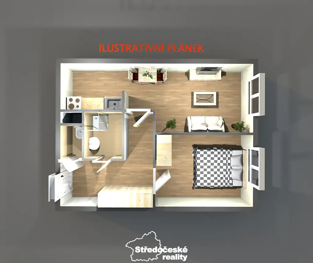 Základní popis bytu: vstupní chodba (vestavěná šatní skříň), samostatné WC, koupelna se sprchovým koutem a pračkou, samostatný pokoj (postel, skříňka), obývací pokoj (sedací souprava, stůl, obývací stěna), kuchyňský kout (kuchyň, lednice, jídelní stolek + tři židle).