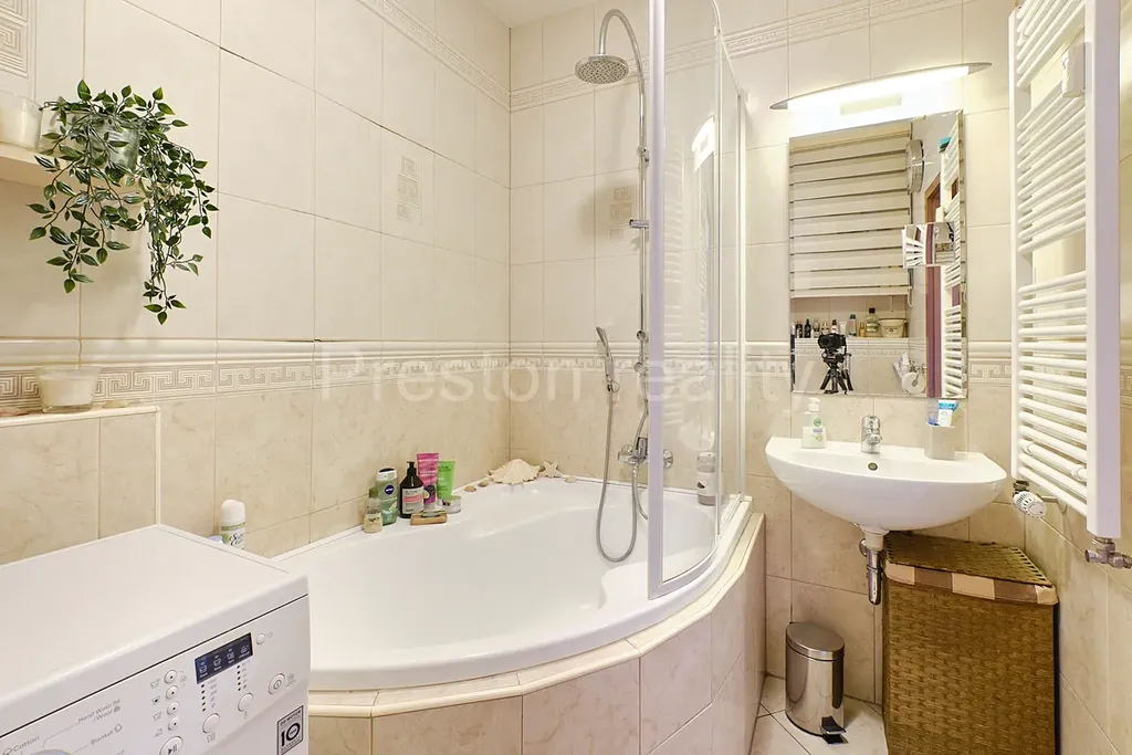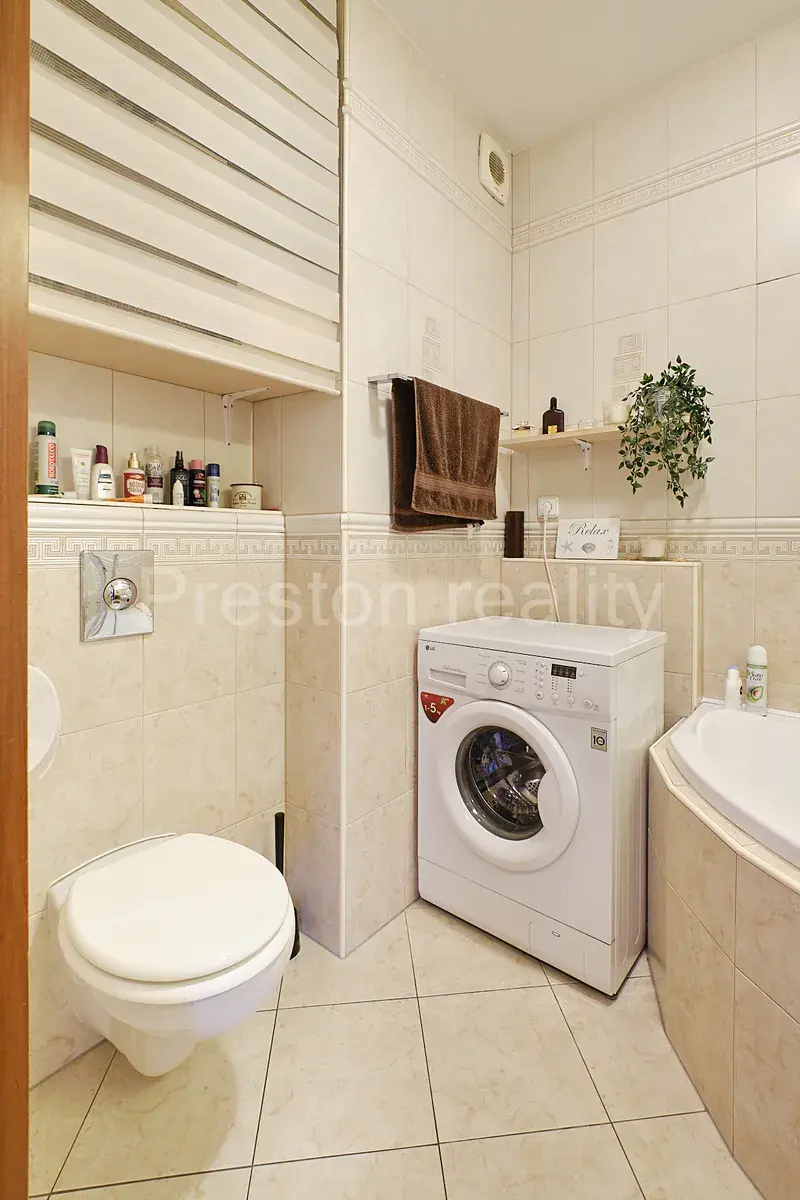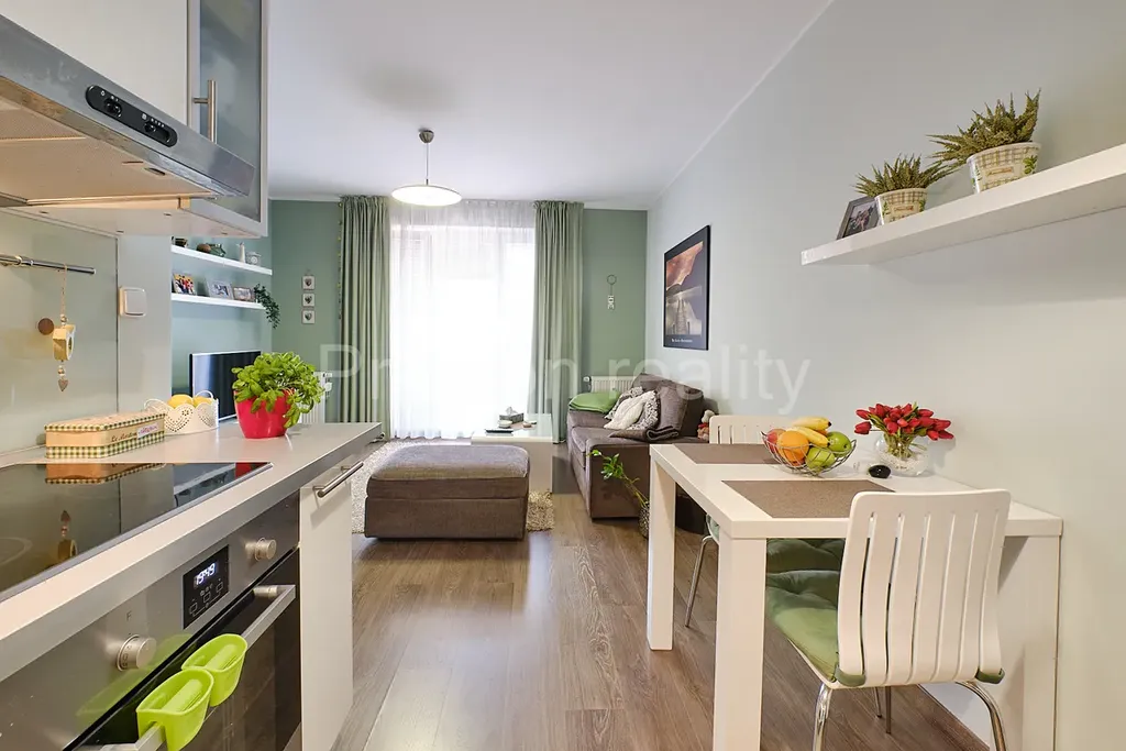 Byt se skládá ze dvou místností, obývacího pokoje s plně vybavenou kuchyňskou linkou (23 m2) a ložnice (12 m2). Koupelna je společná s WC, je vybavena vanou a pračkou. Byt se pronajímá jako plně vybavený tak, jak je zobrazeno ve fotodokumentaci, budou odvezeny privátní věci a některé doplňky bytu, veškerý nábytek zůstává. V obývacím pokoji je velká rozkládací pohovka, jídelní stůl se židlemi, a stolek s TV. Z obývacího pokoje je vstup na zastřešenou lodžii s posezením, která skýtá hezké výhledy do tichého vnitrobloku se zelení. Moderní kuchyňská linka je plně vybavena všemi spotřebiči: sklokeramickou varnou deskou, elektrickou troubou, mikrovlnnou troubou, lednicí s mrazákem a kávovarem. Nádobí není součástí nájmu.