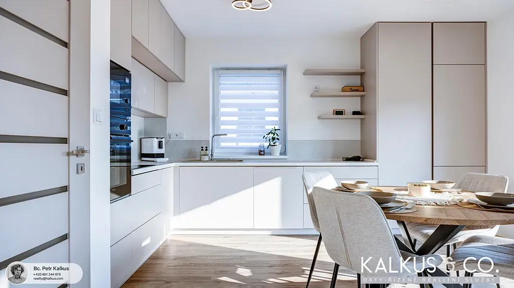 Součástí prodeje je veškeré vybavení dle fotografií – moderní kuchyňská linka od truhláře se spotřebiči a potravinovou skříní s výsuvy (výsuvný potravinový systém), pohovka s elektrickým výsuvem, TV, postele, skříně a další zařízení. Dům, spotřebiče i vybavení jsou stále v záruce.
